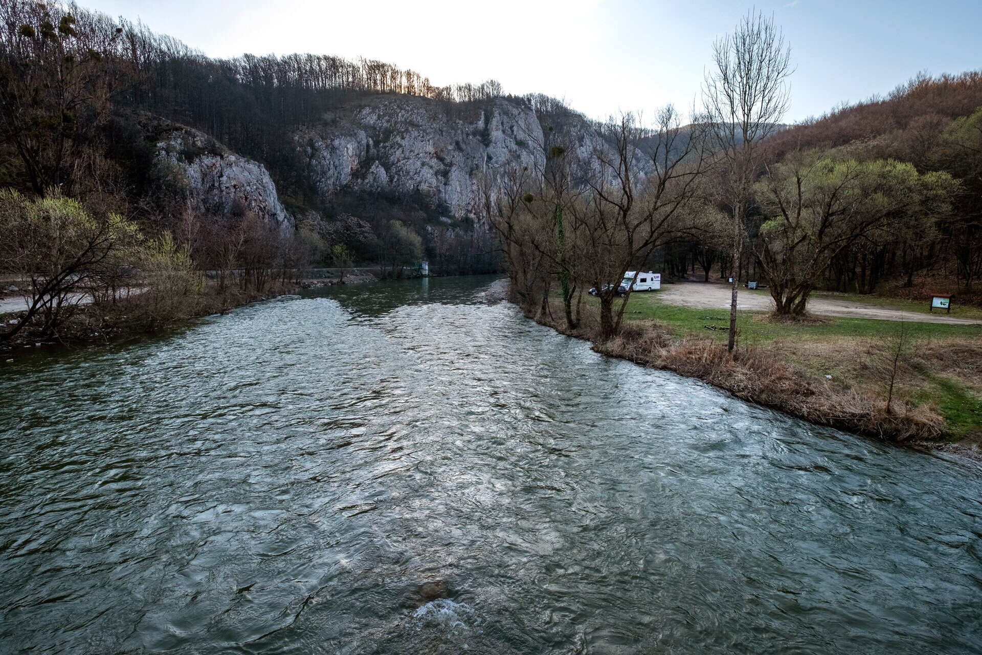 Kilátás a hídról, jobb oldalon az említett parkoló, szemben pedig a szoros bejárata. A Révi-szorost Erdély kapujának is hívták, hiszen a magas hegyek és sziklák övezte Erdélyi-medence és az Alföld között sokáig a szoros és a benne robogó Sebes-Körös jelentette az egyetlen „járható” kapcsolatot.