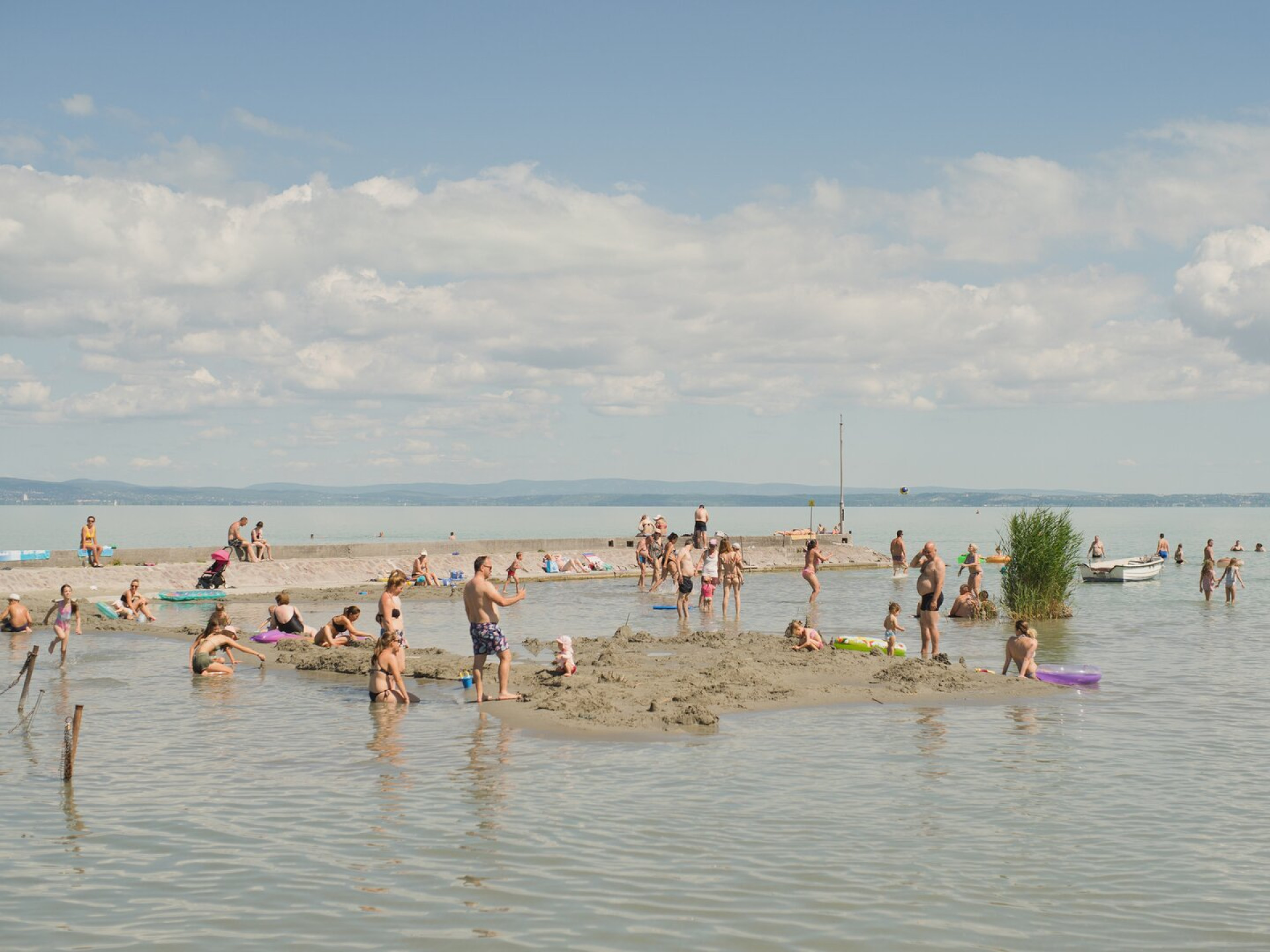 Fürdőzők az alacsony vízállású Balatonban a nyári kánikula idején. Hőhullámok idején az emberek a városokból a vízpartok mellett hűsölnek. De a Balaton (Magyarország legnagyobb, 592km2 kiterjedésű természetes tava) vízszintje is folyamatosan csökkent. Májusban a tó átlagos vízszintje 105 cm körül volt. Augusztus végére 78 cm-re csökkent.