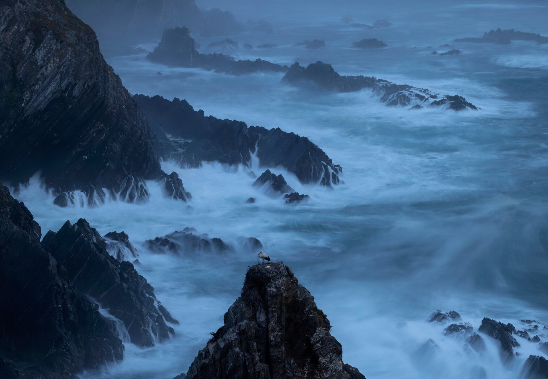 Gólyák élete. "A bakancslistámon szerepelt a portugál partokon fészkelő gólyák fotózása. Végül sikerült meglátogatnom ezt a helyet, és néhány csodálatos napot eltölteni ott. A sziklák, ahol gólyák fészkelnek, a tengerből kiálló sziklatömbök és sós párának vannak kitéve. Nagy élmény volt pár napig a partról nézni minden napjaikat."