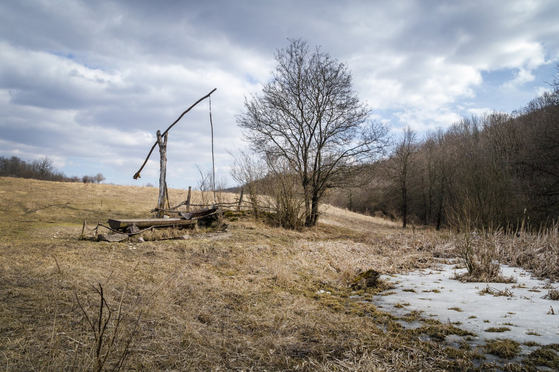 Gémeskút és itató a legelő állatoknak, ami itt szürkemarhákat jelent. Bár az állatok még a téli szálláson vannak