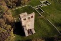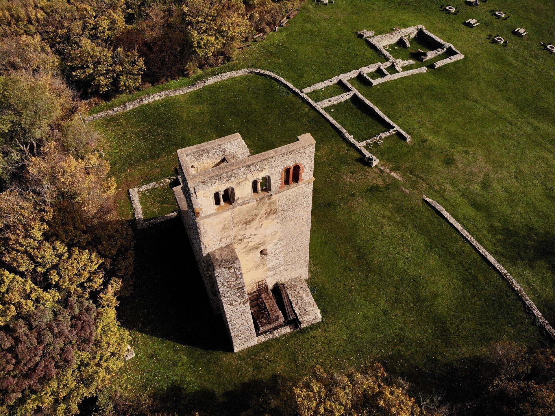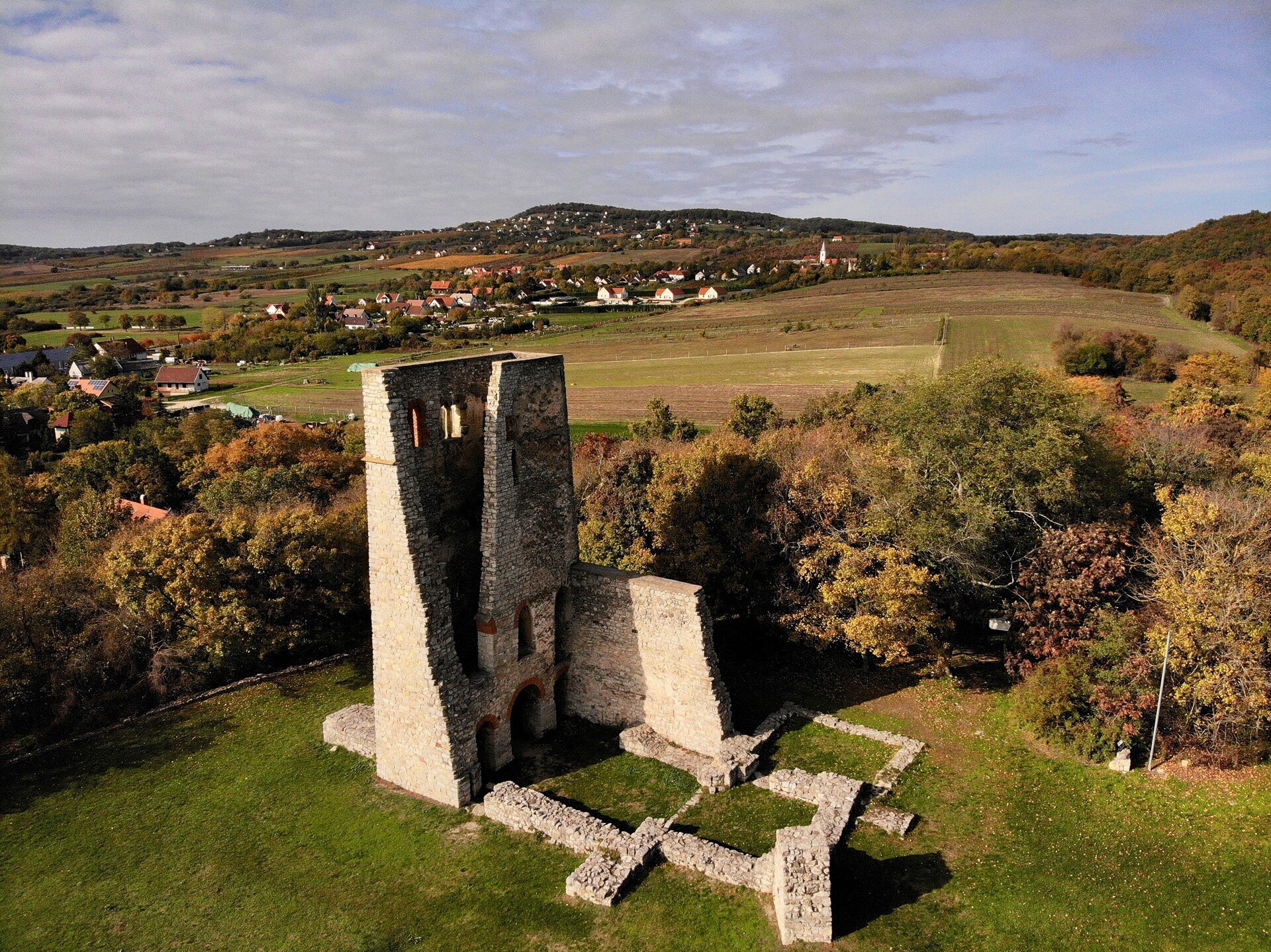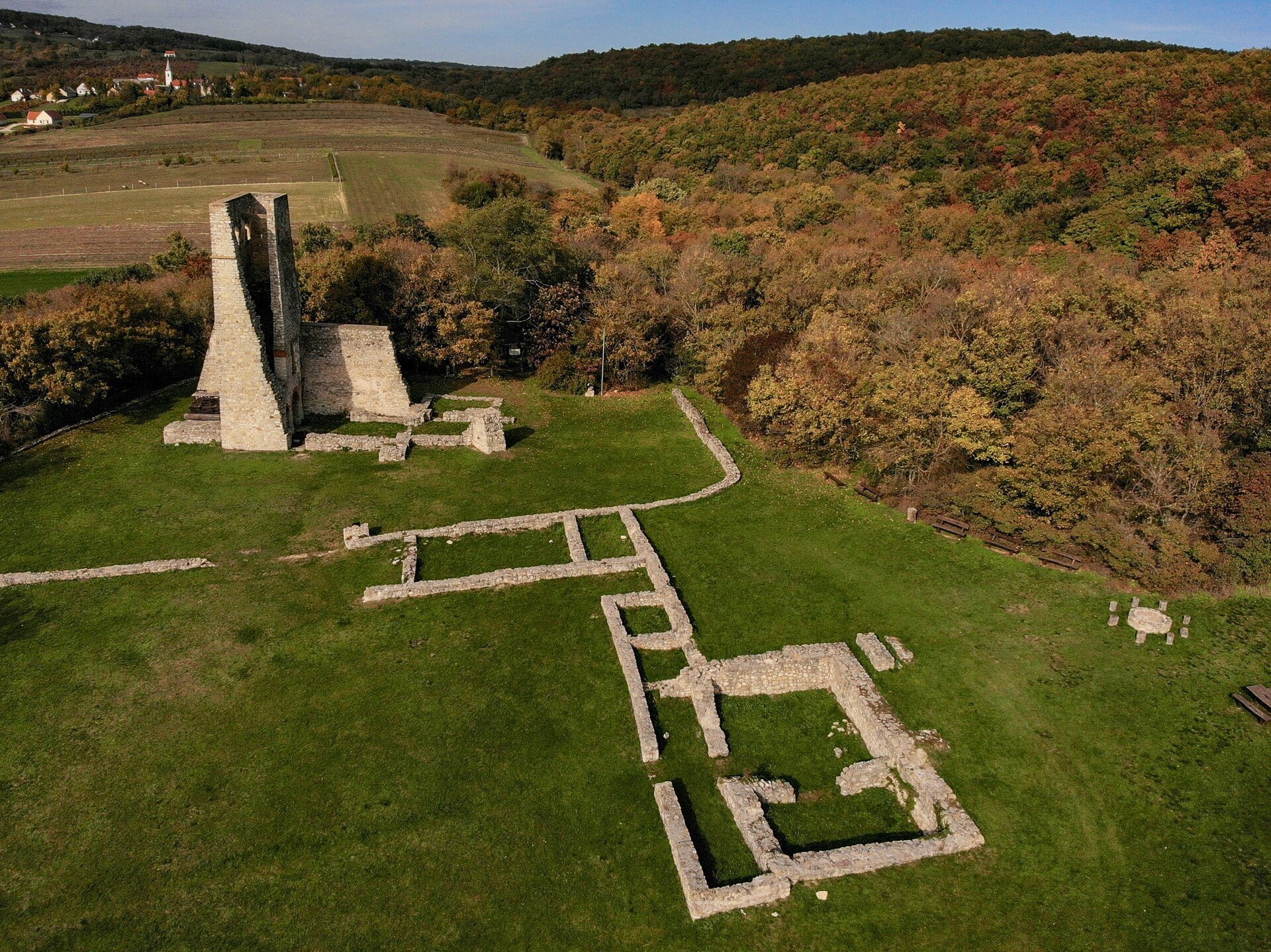 Madártávlatból a középkori egyházi építészet szép emléke, a romok mellett kiépített pihenőhelyet találunk