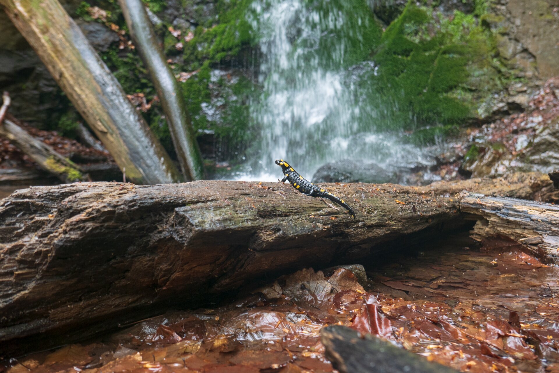 Az erdők egyik szépséges lakója, a foltos szalamandra. Ez a példány az Ilona-völgyi vízesésnél pózolt