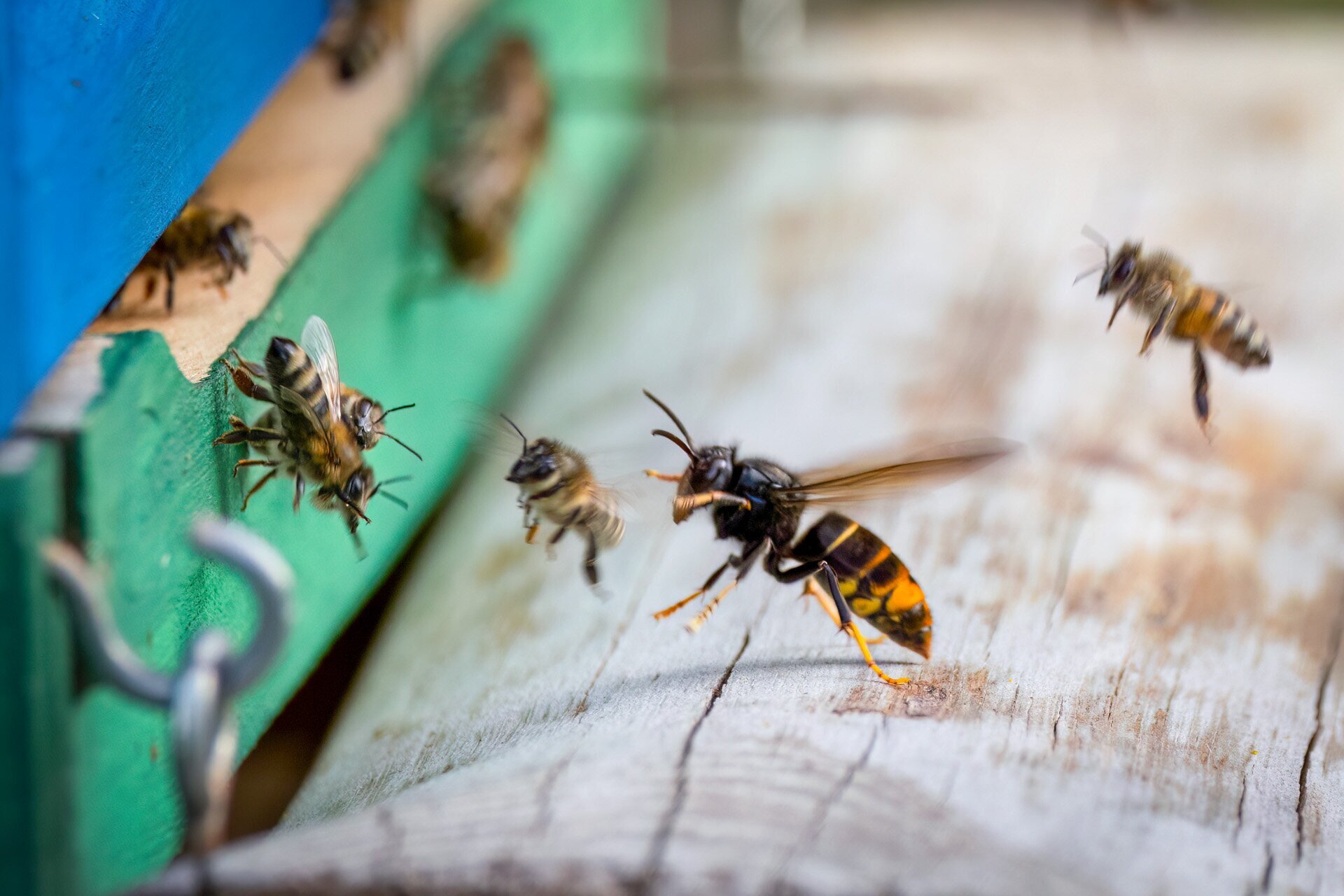 Ázsia lódarázs vadászik egy méhkaptárnál