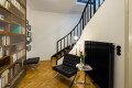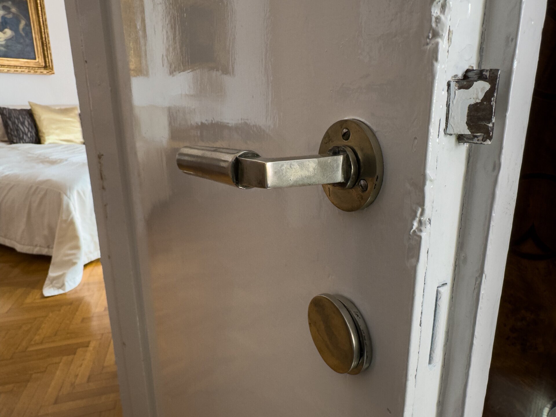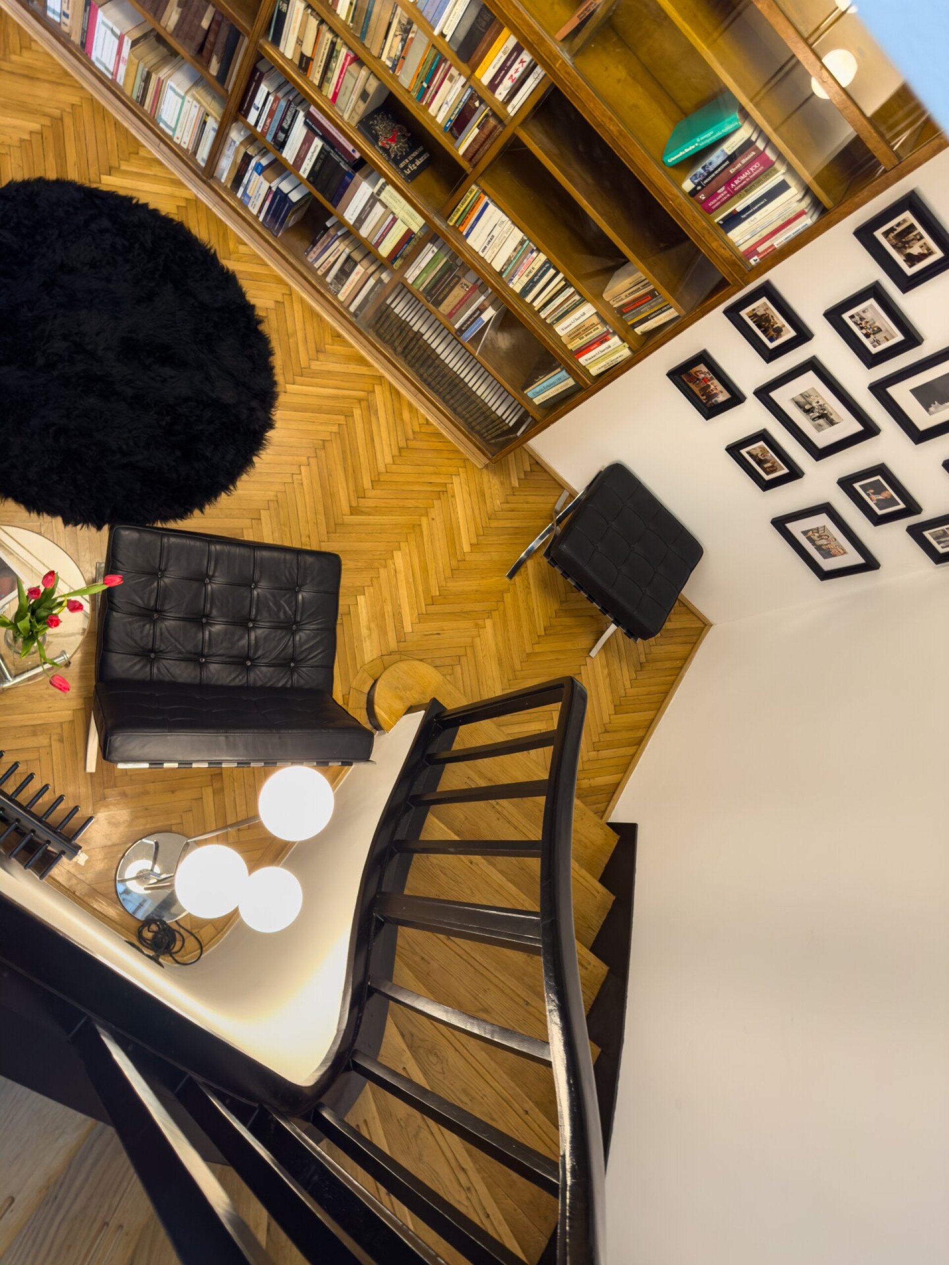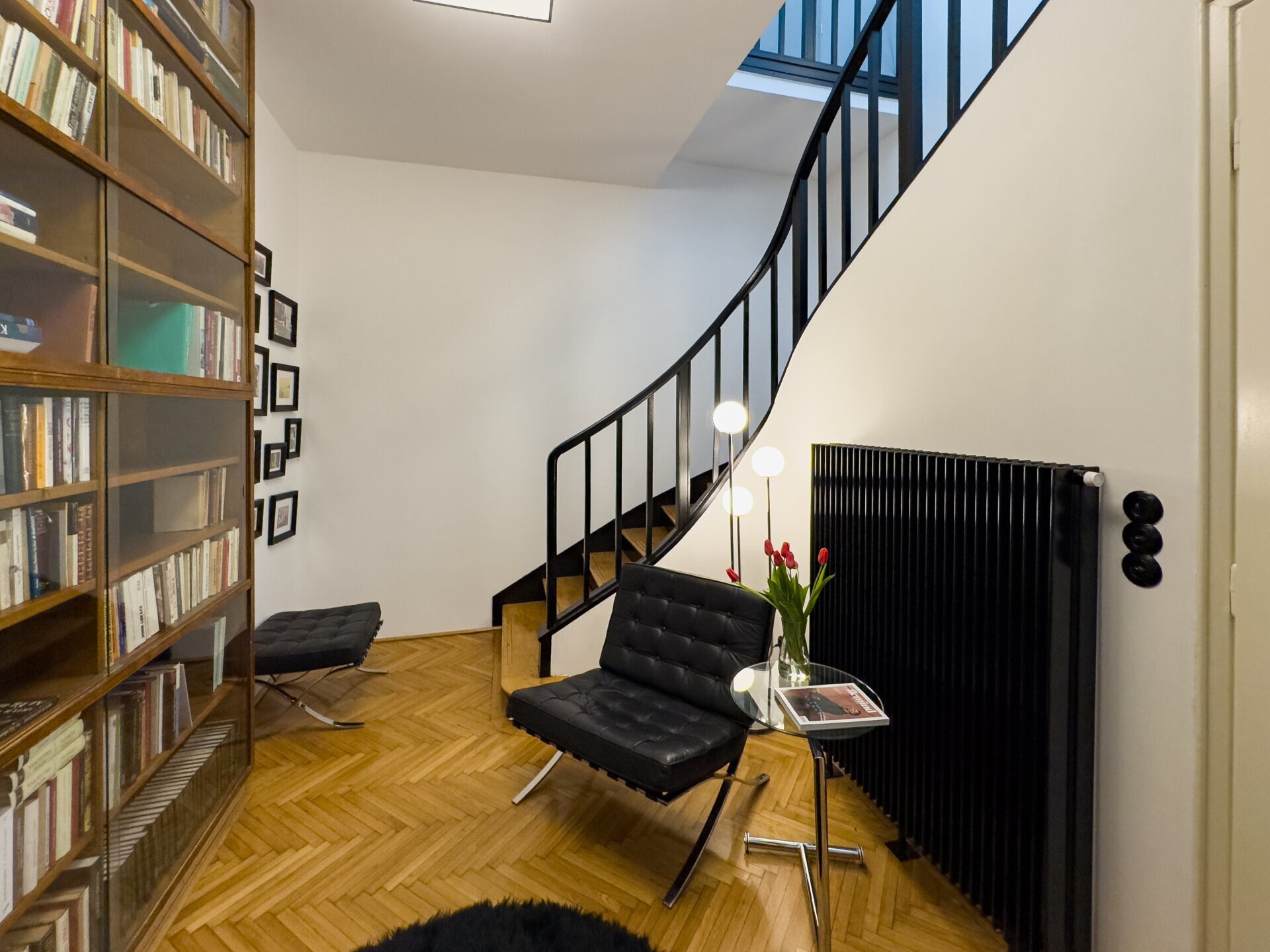 A földszint részlete az épület eredeti főlépcsőházával, illetve a Bauhaus zsenijének, Ludwig Mies van der Rohe Barcelona székének egy példányával