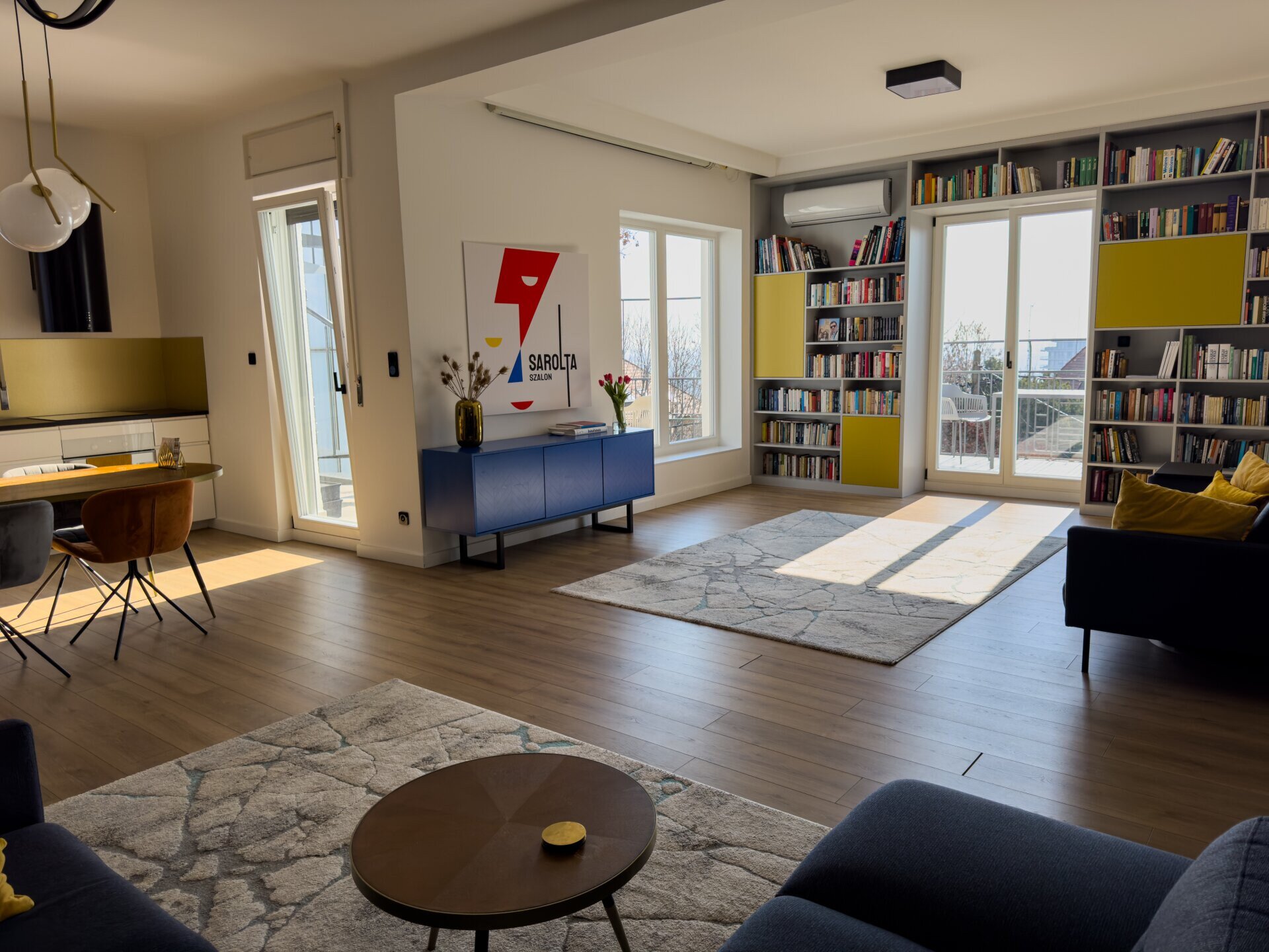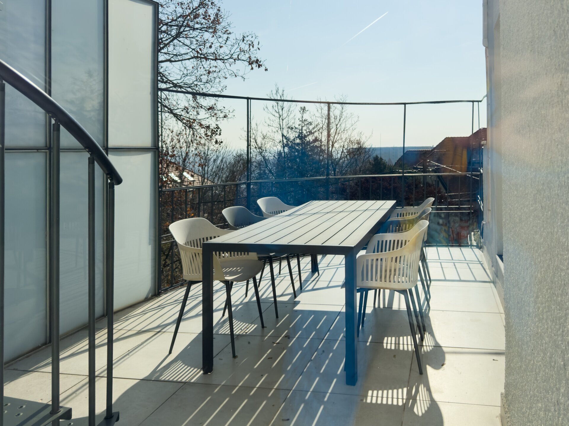 A Hevesy-villa lakása elsősorban a táj felé nyílik, ahol tágas teraszok is helyet kaptak