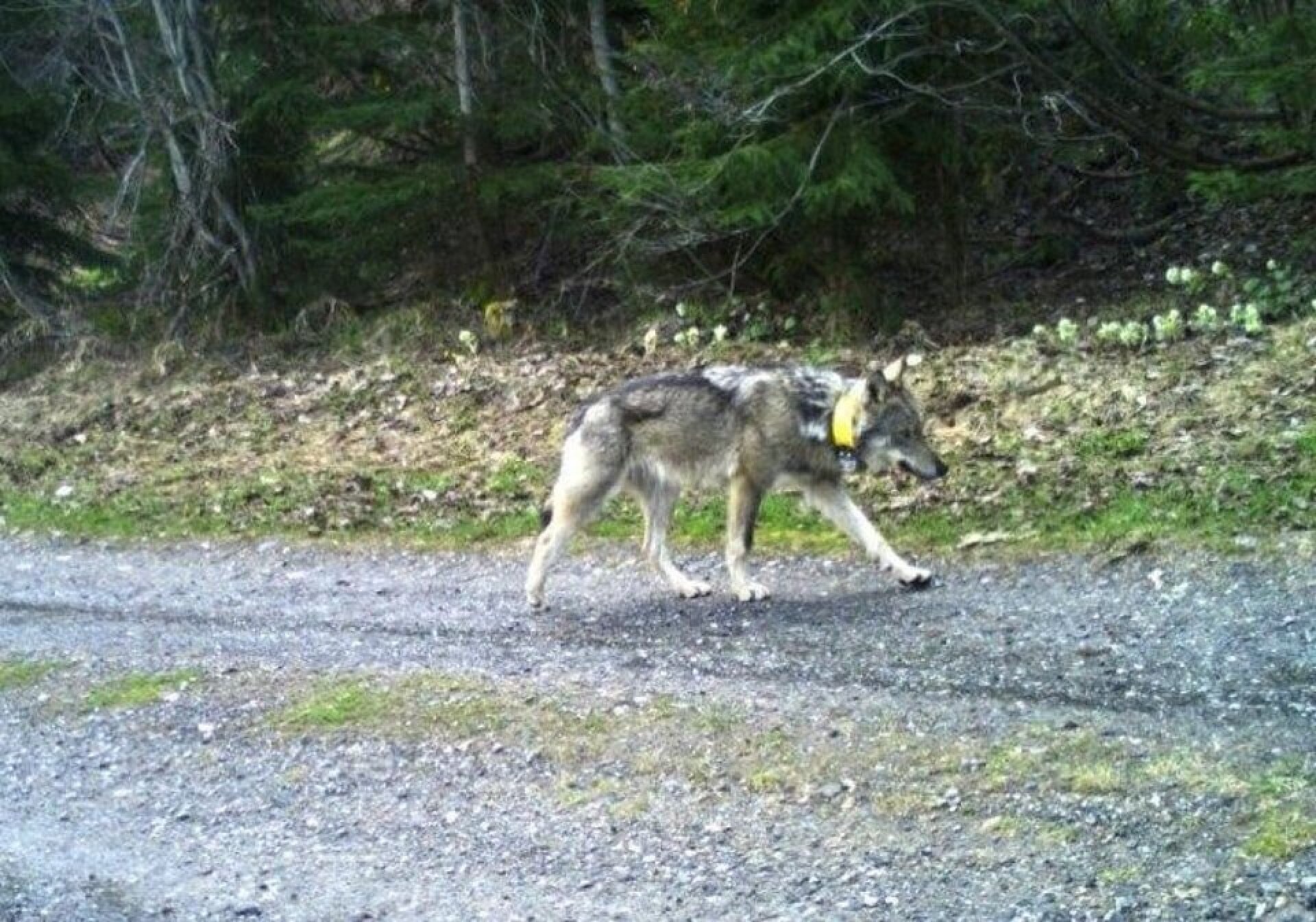 A Gruppe Wolf Schweiz svájci szervezet közösségi oldalára felrakott fotó a jeladóval ellátott farkasról