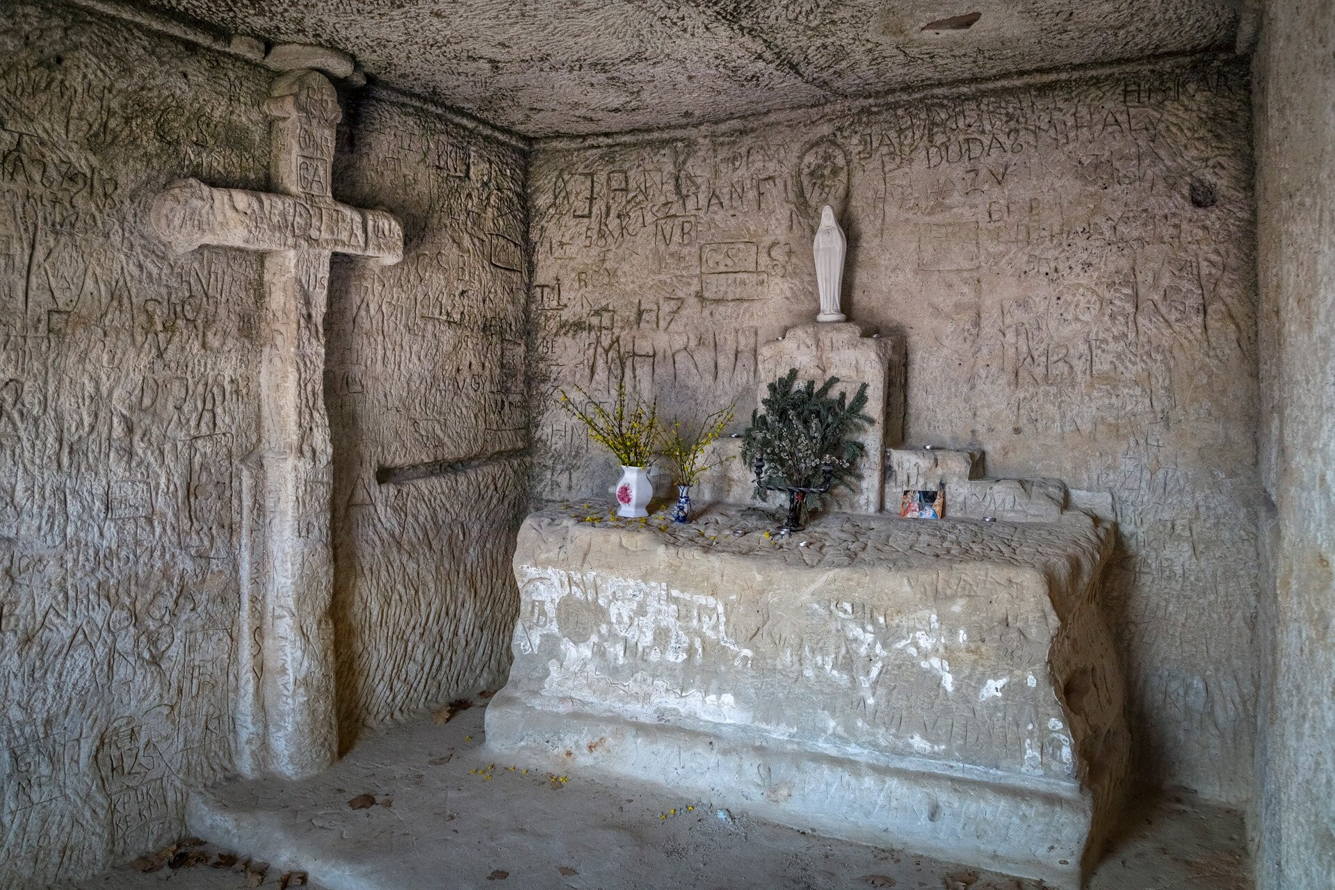 A templomtól a barlang jelzést követve egy rövid, de meredek kaptatón juthatunk fel a remetebarlangokhoz