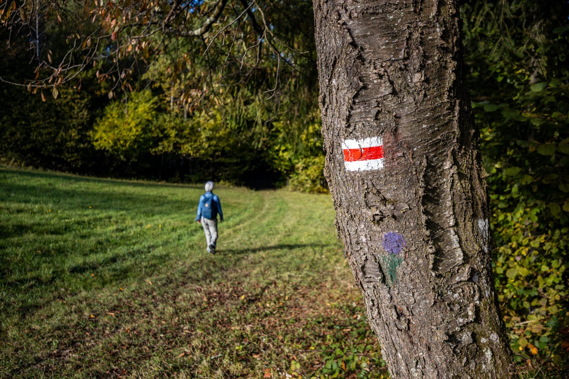 A völgyben a piros sáv jelzés mellett találkozunk a Réti orchidea tanösvény jelzésével is