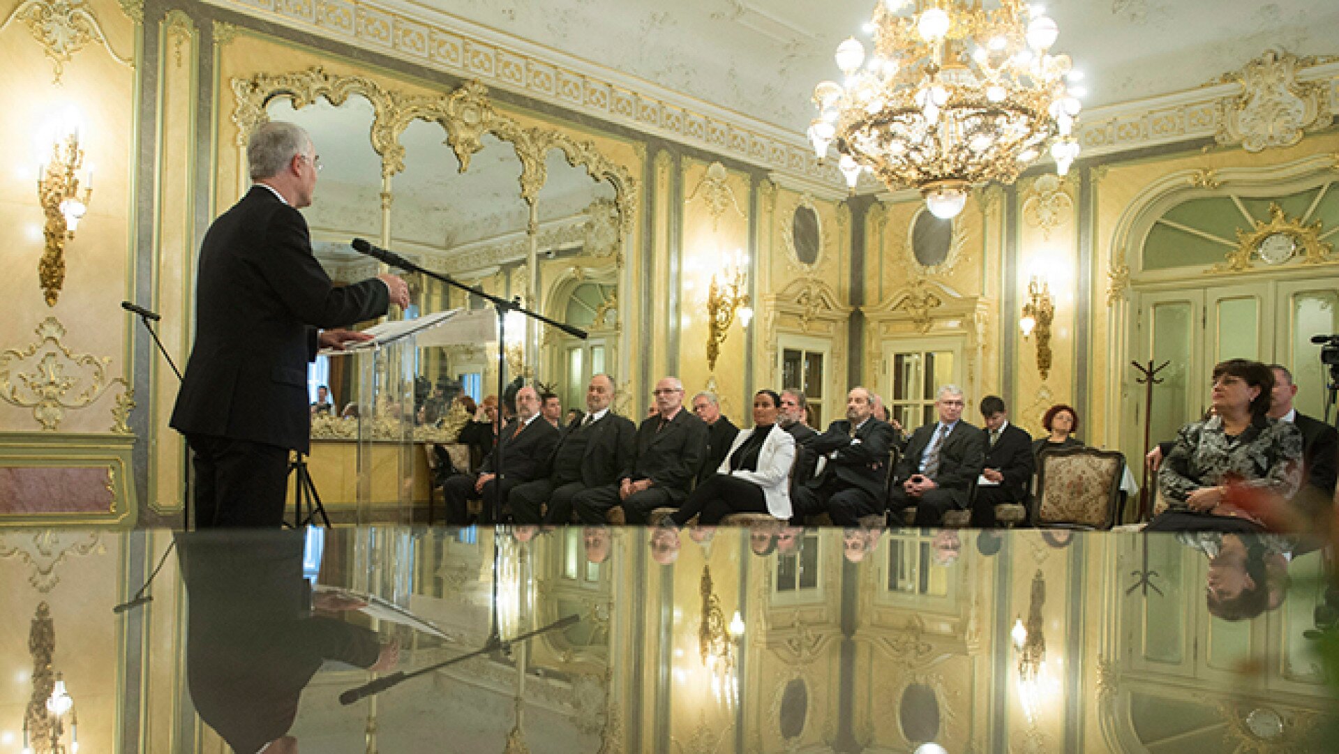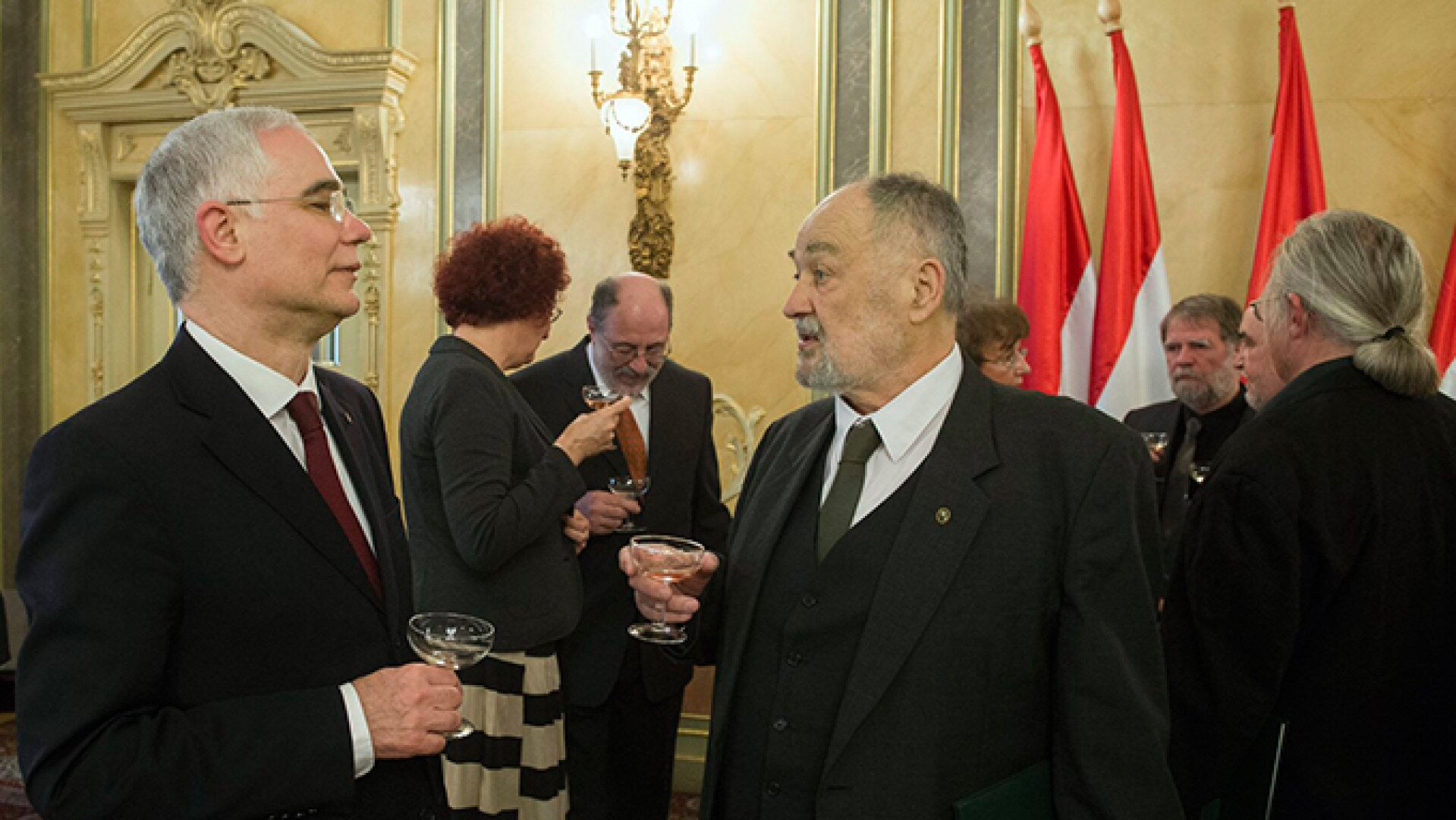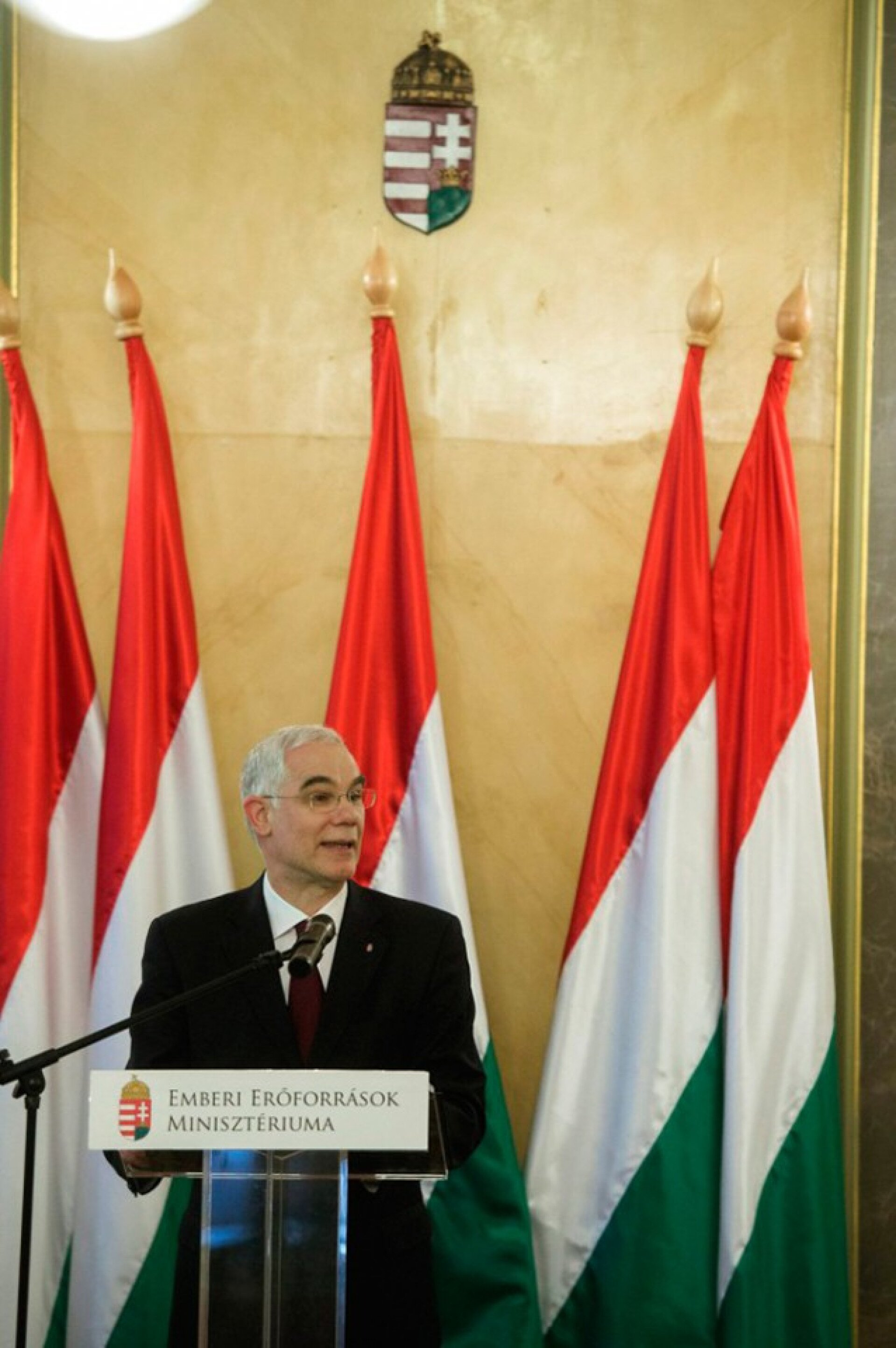 Balog Zoltán, az emberi erőforrások minisztere beszél, mielőtt állami kitüntetéseket adott át a Másfélmillió lépés Magyarországon című filmsorozat alkotóinak