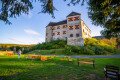 Első állomásunk: ezt látjuk, amikor belépünk a várba. Az alsó udvarból vehetjük szemügyre az épület legrégebbi részét, az őrtornyot, ami a 13. században épült, és a német betörések kivédésére húzták fel. A vár bővítgetését a 17. században fejezték be, és a templomos lovagok után számos nemesi család birtokolta: a Kanizsaiak, a Nádasdyak és az Esterházyak is. Végül egy osztrák író, Paul Anton Keller tulajdonába került, aki teljesen felújíttatta, ma pedig alapítvány működteti.