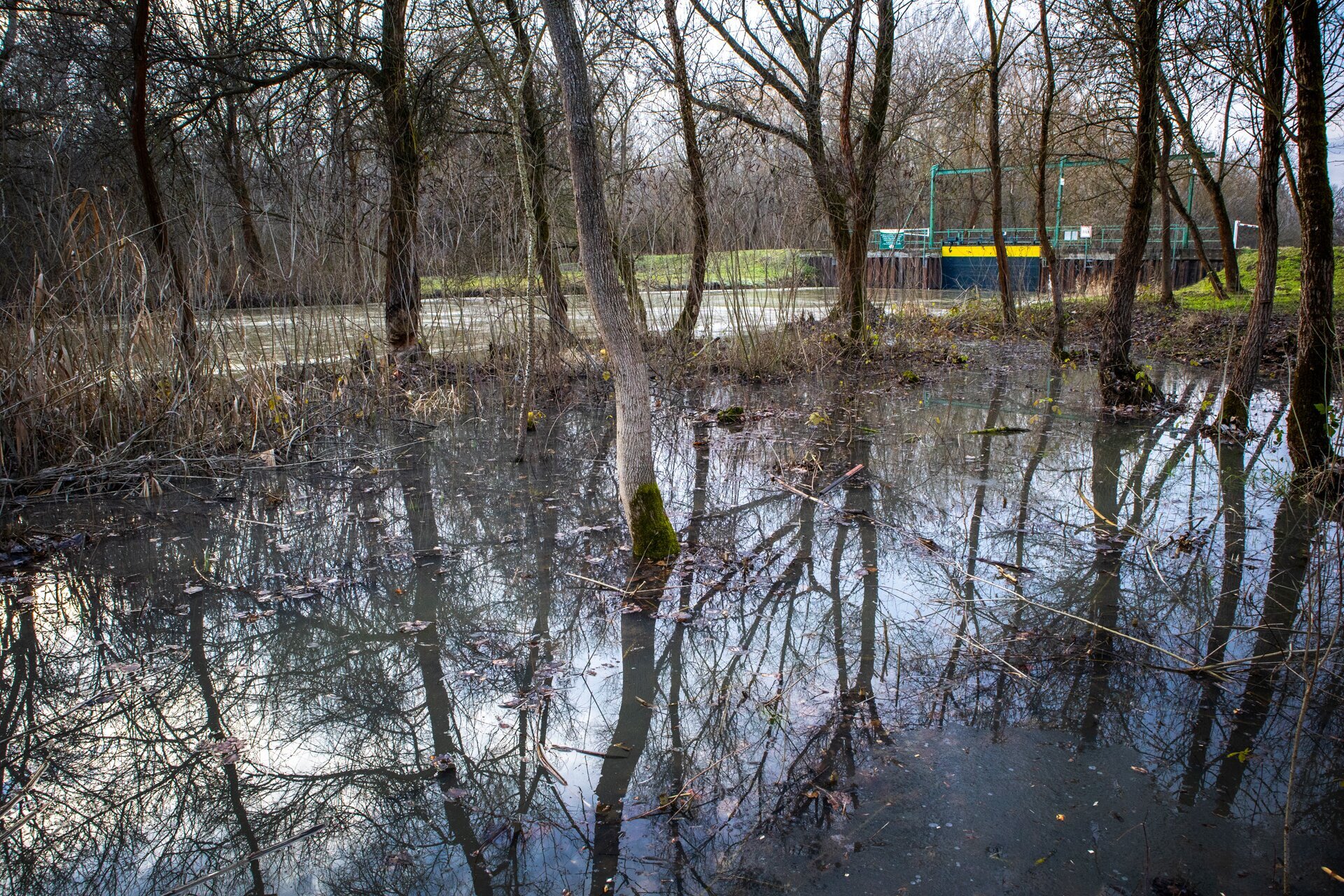 A fák mögött látható a Kis-Tisza medre, ami már megtelt, így a víz kiöntött a környező területekre