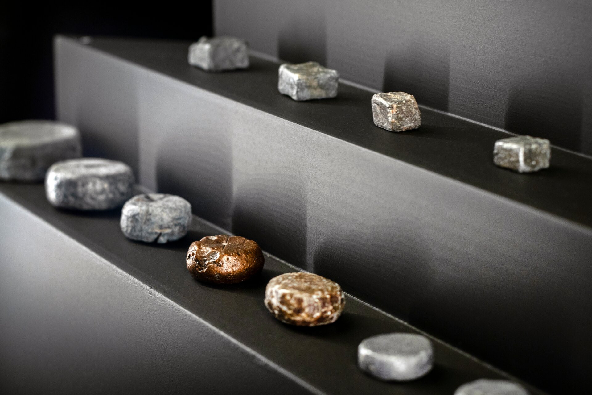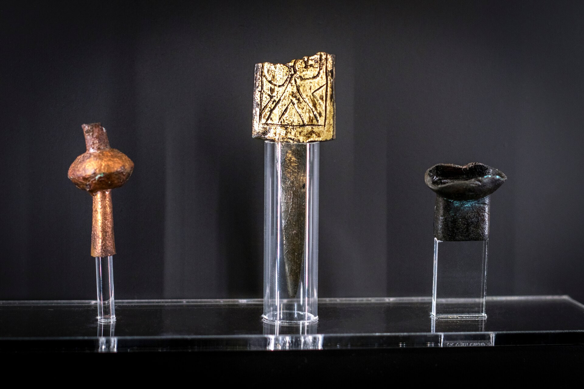 Egy Árpád-korban használt mérleg, alatta különböző súlyok láthatók