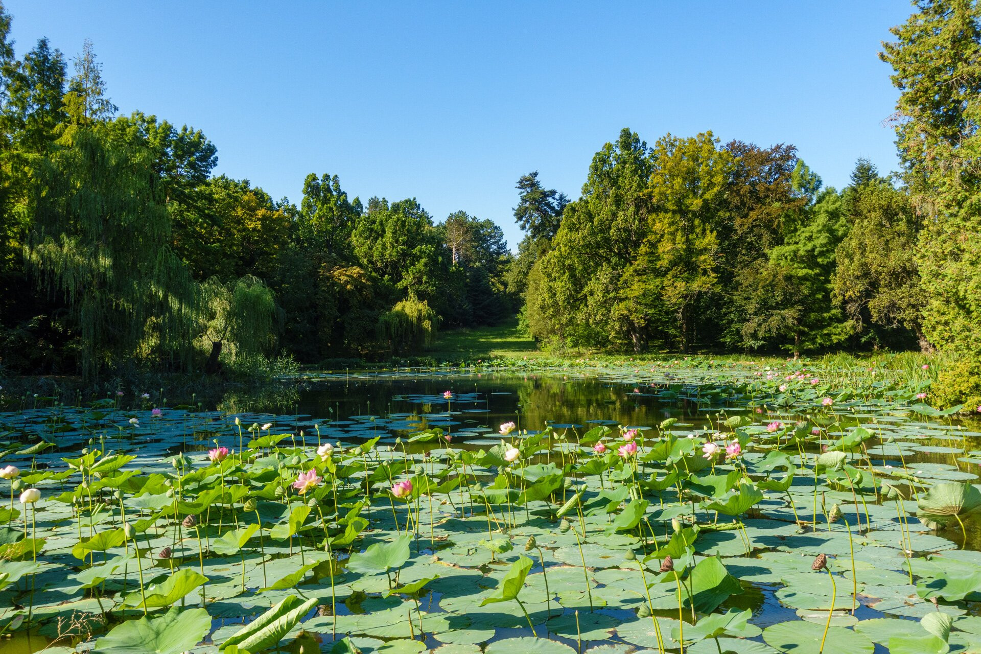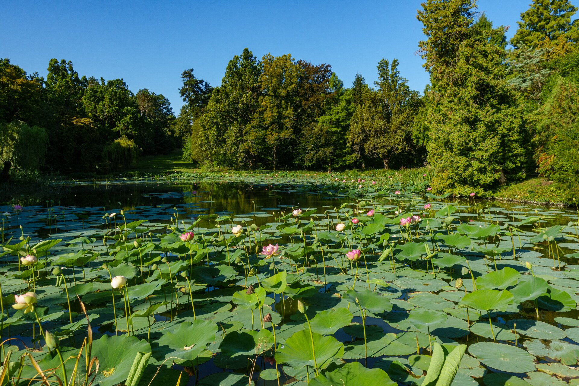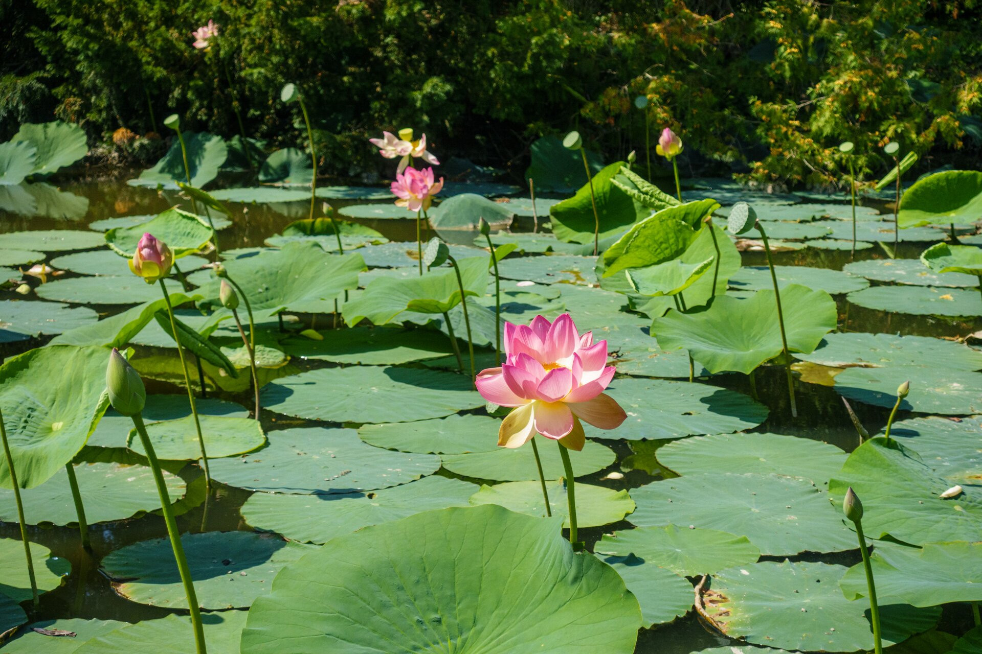 A kert központi helyén található Nagy-tó vízfelszínét szinte teljesen beborítják az indiai lótuszok