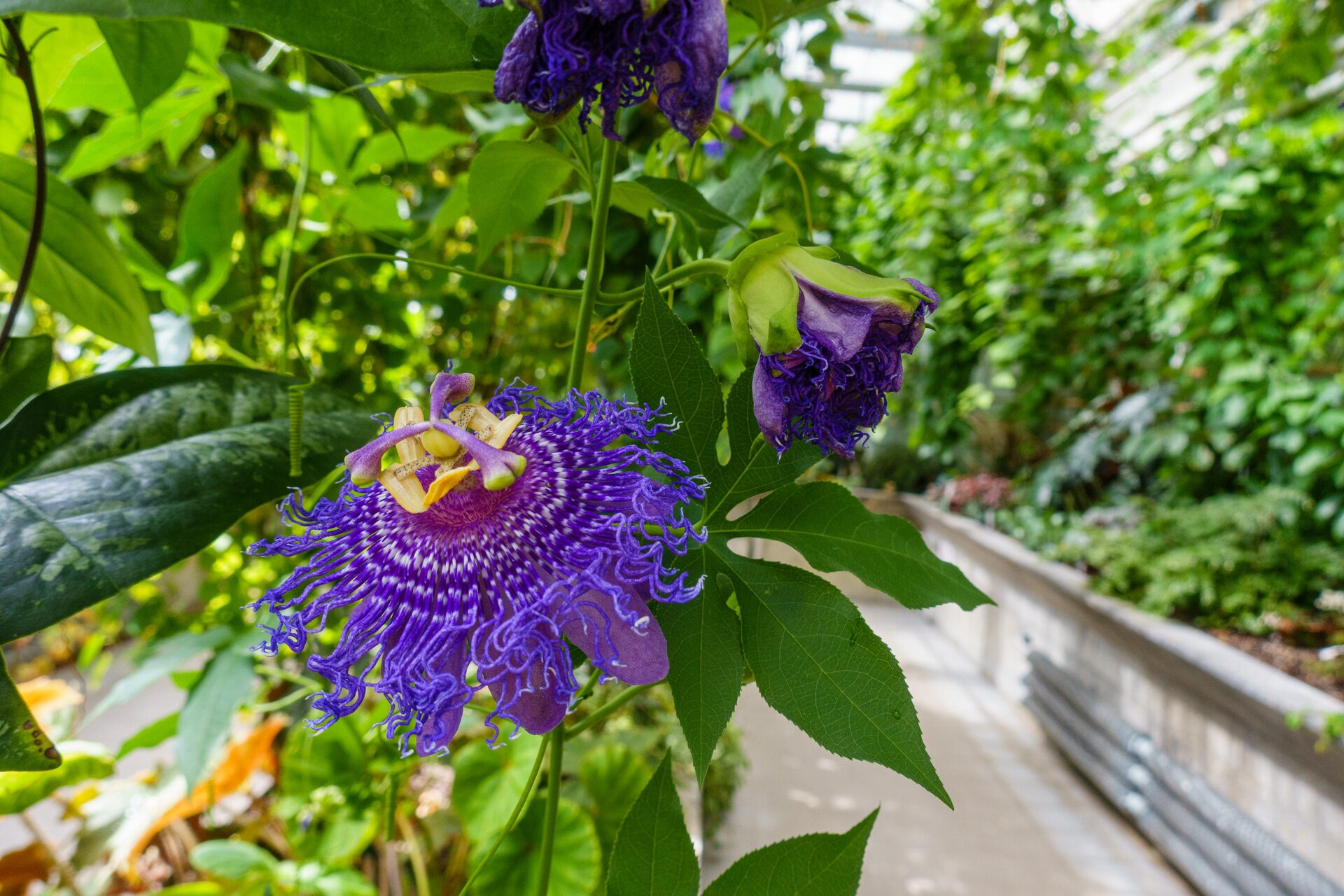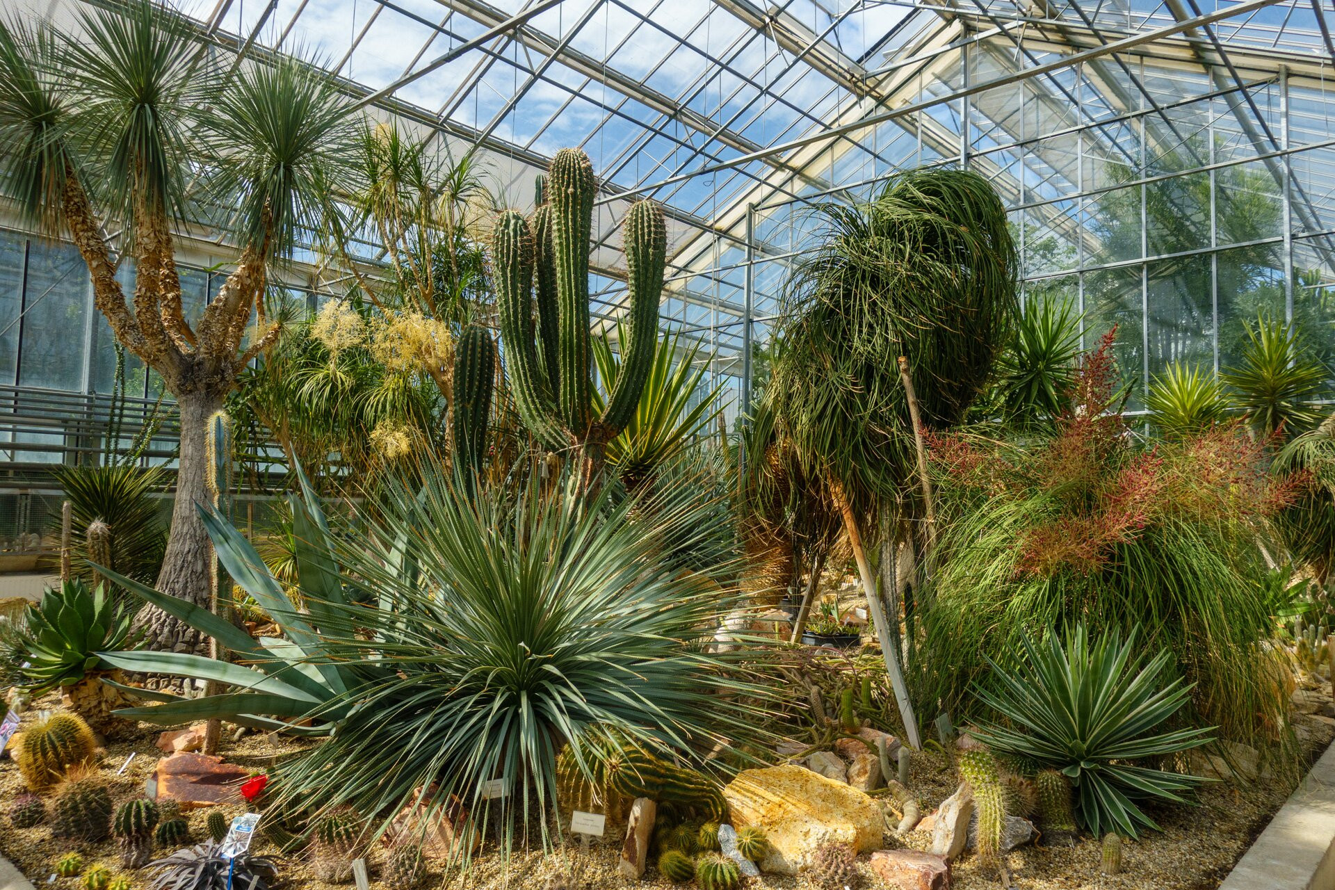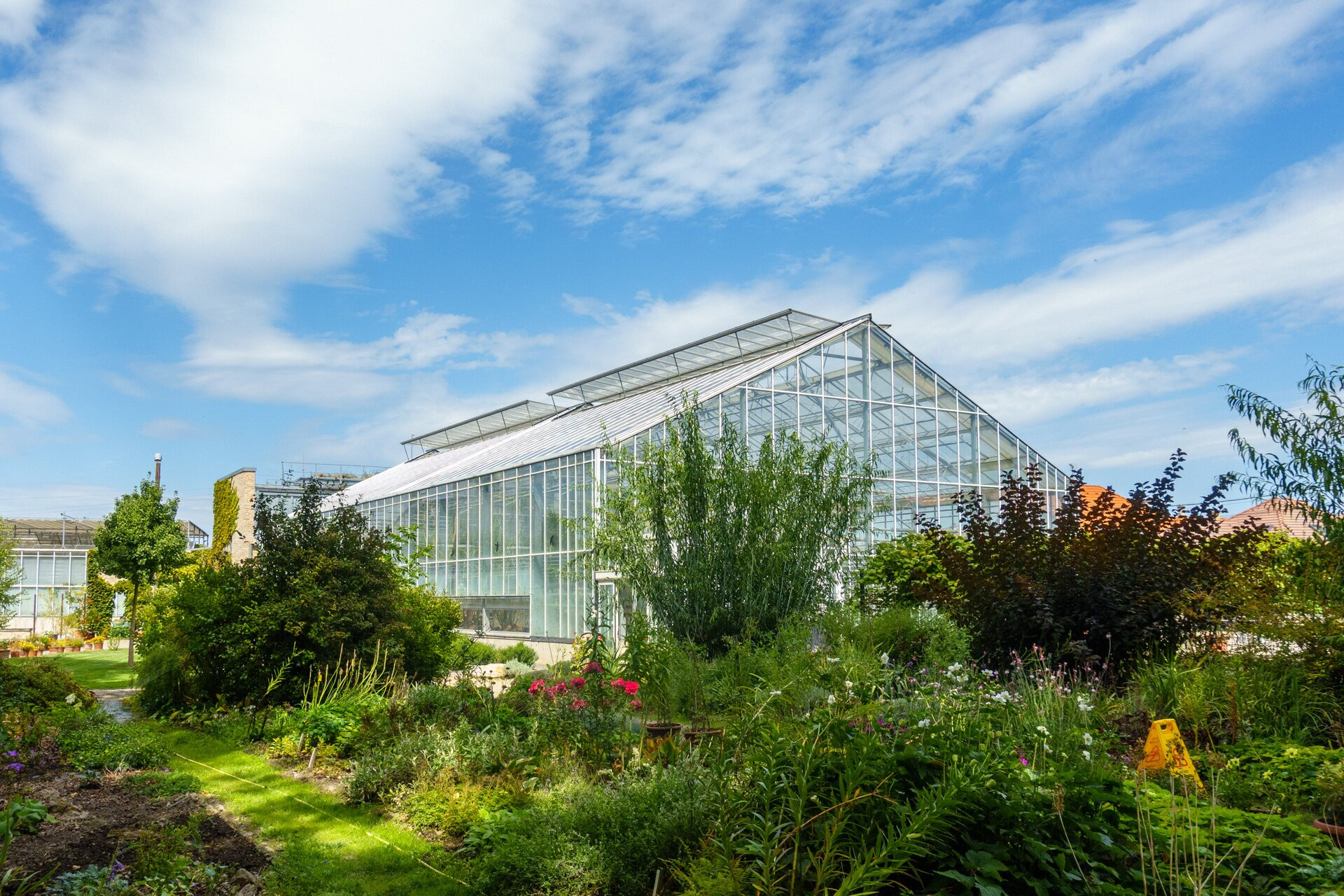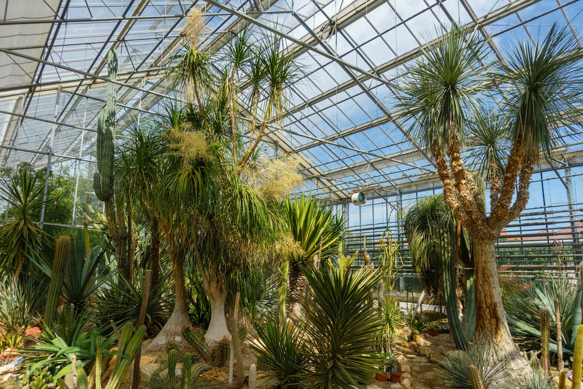 A botanikus kertben három üvegház látogatható: a Pálmaház, az Orchidea- és Broméliaház, illetve a Kaktusz- és Pozsgásház