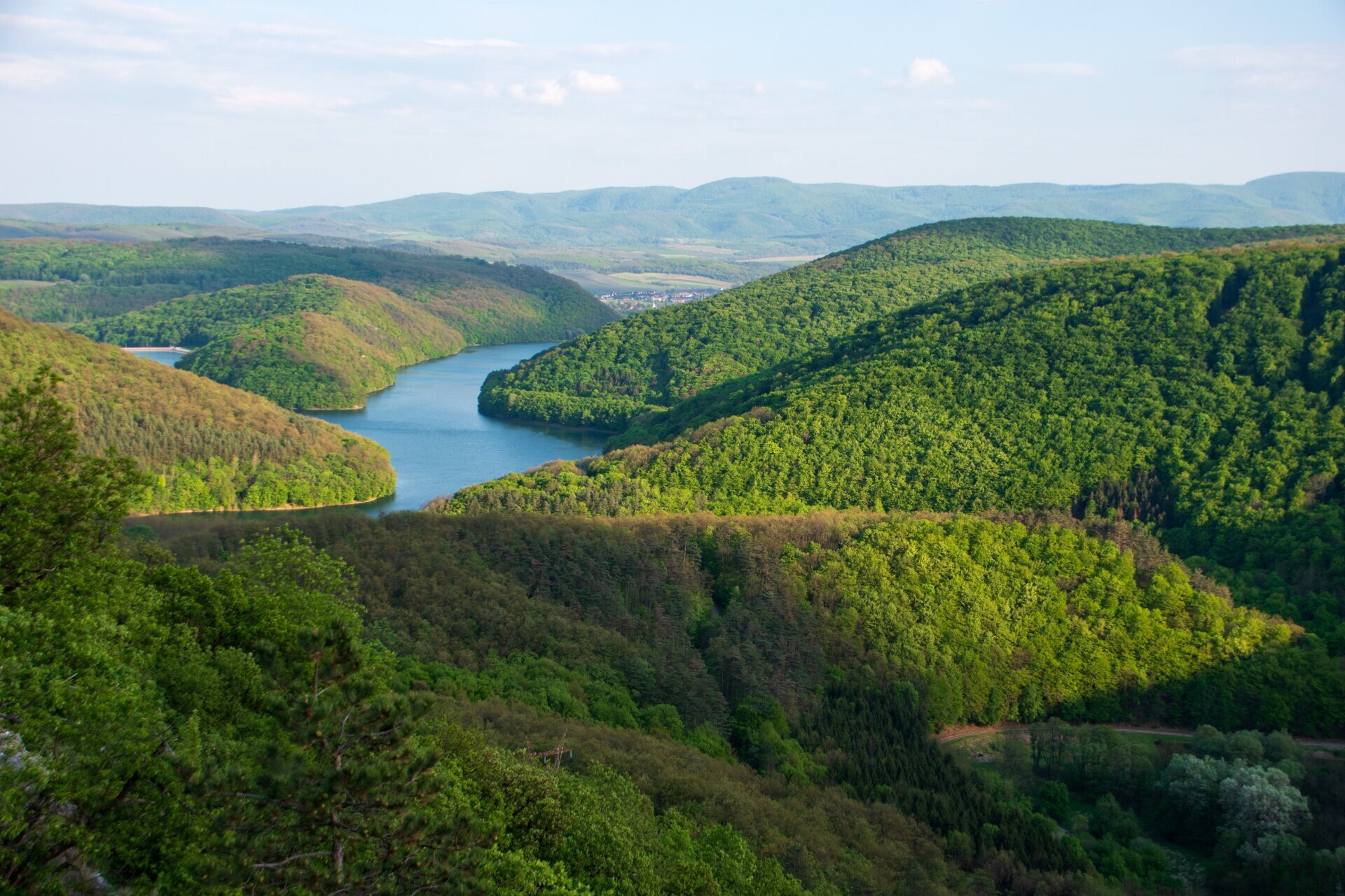 A Lázbérci-víztározó kék szalagja simul az Upponyi-hegység erdeinek lábához