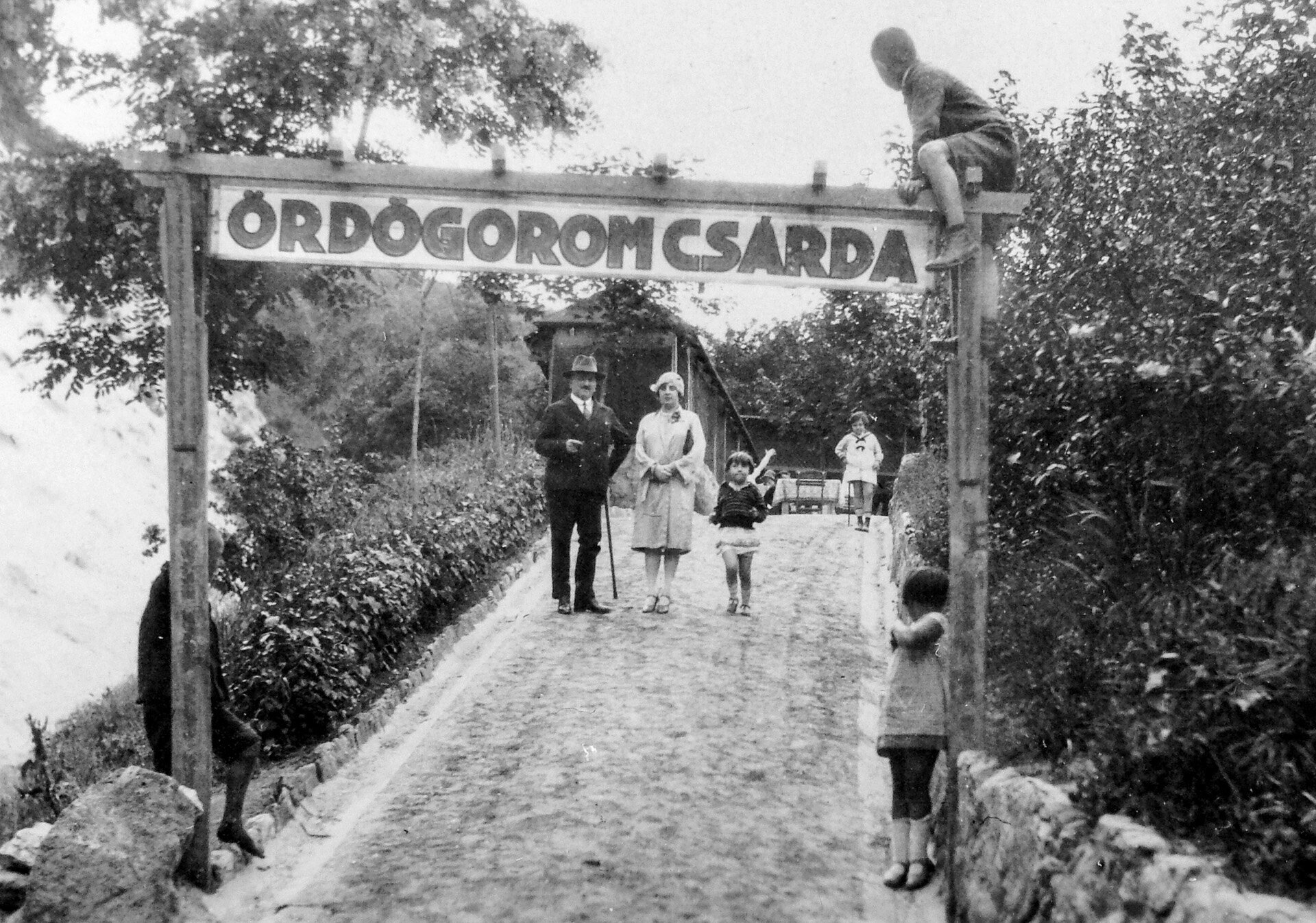 Az Ördögorom csárda bejárata és vendégei 1928-ban