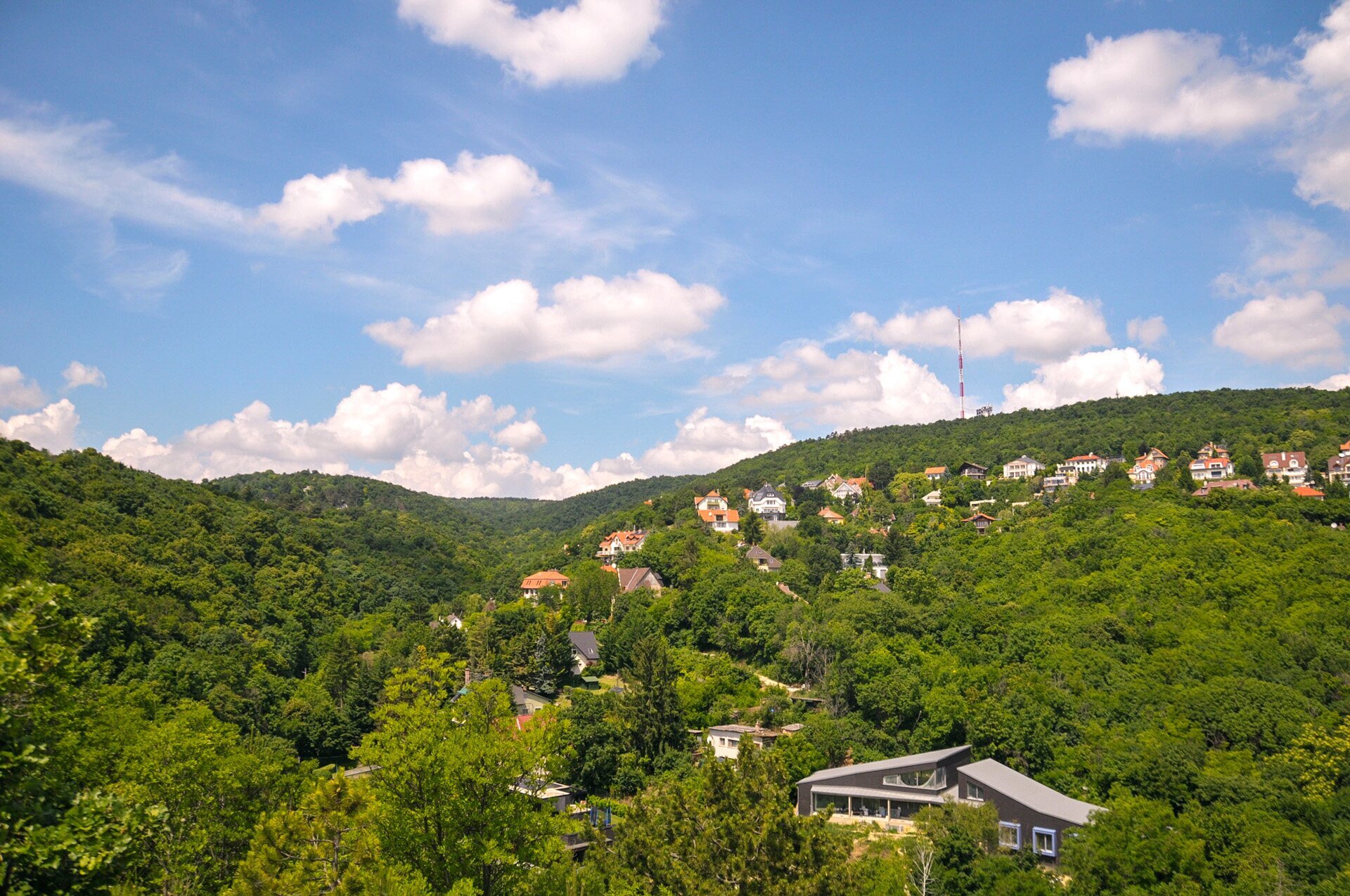 Előttünk a Farkas-völgy, azon túl a Széchenyi-hegy, tetején a tévétoronnyal