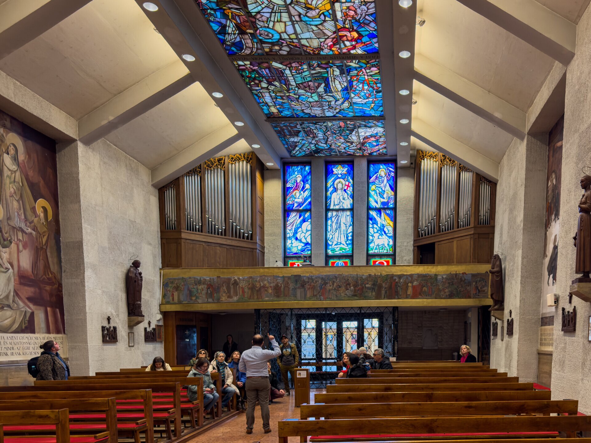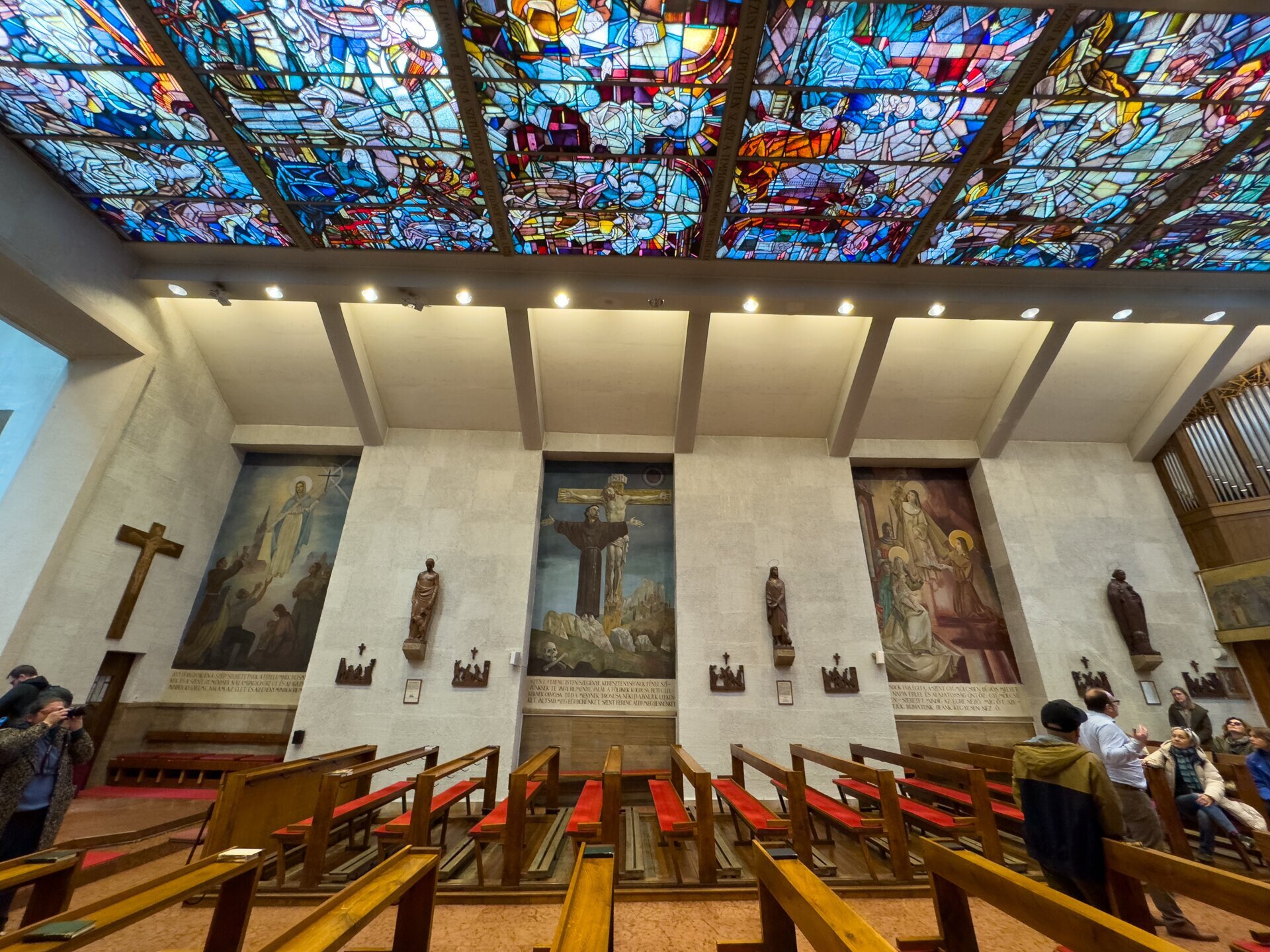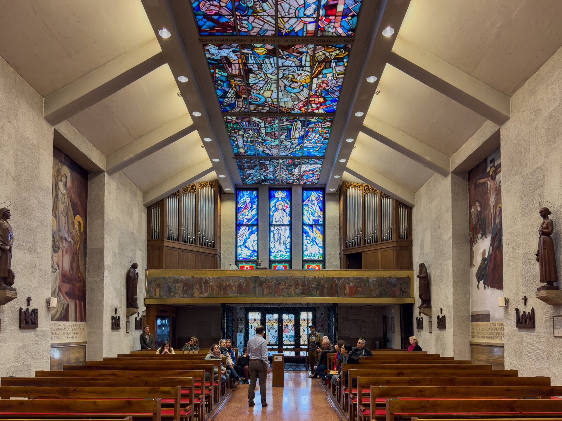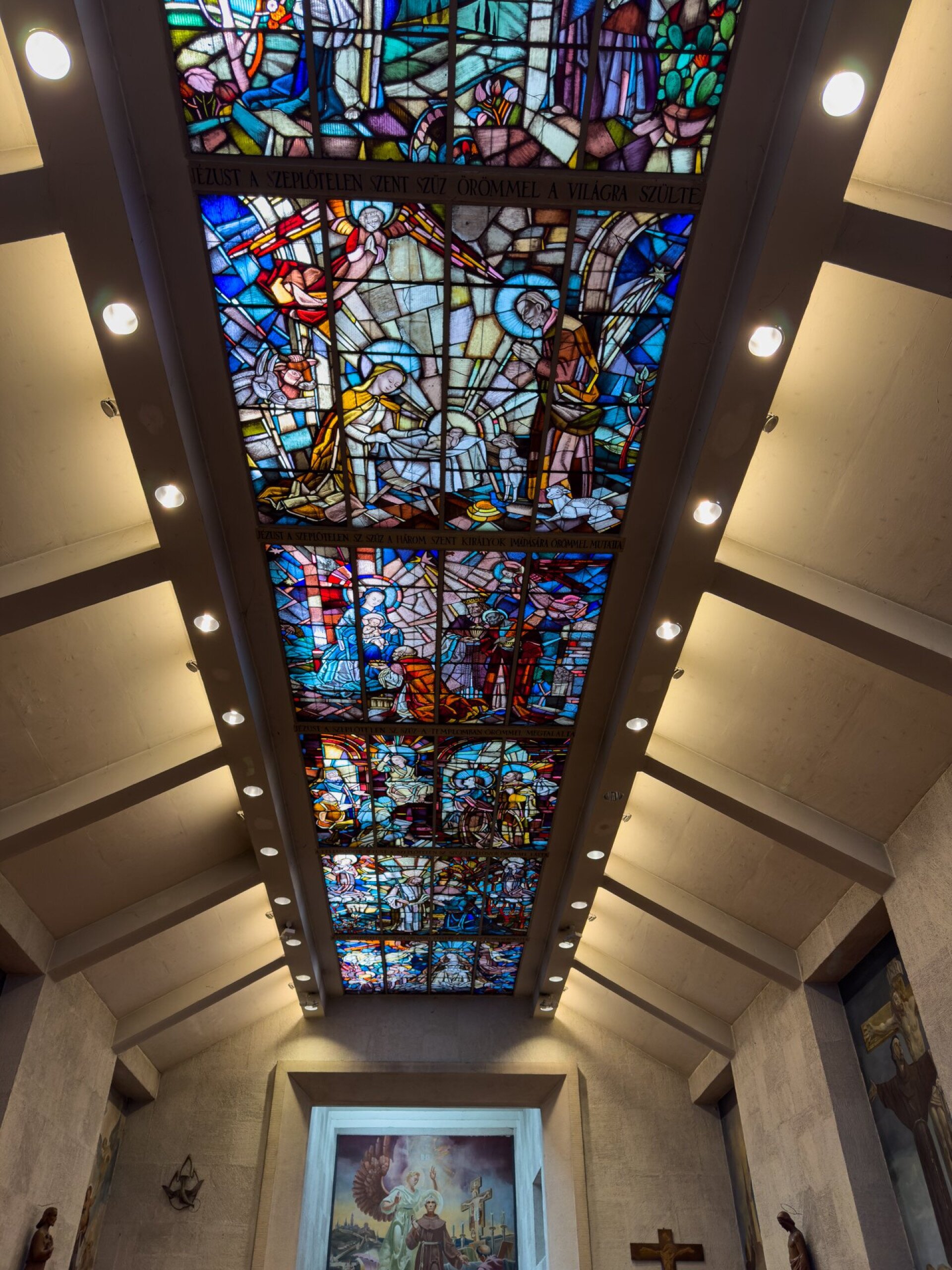 Az épület különlegessége, hogy nincsenek ablakai, a fény a felülvilágítón és a festett mennyezeti üvegen át árad a liturgikus térbe