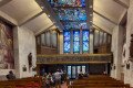 A Pálos Anna által tervezett festett ólombetéses üvegablakok 2002-ben kerültek a templom homlokzati részére