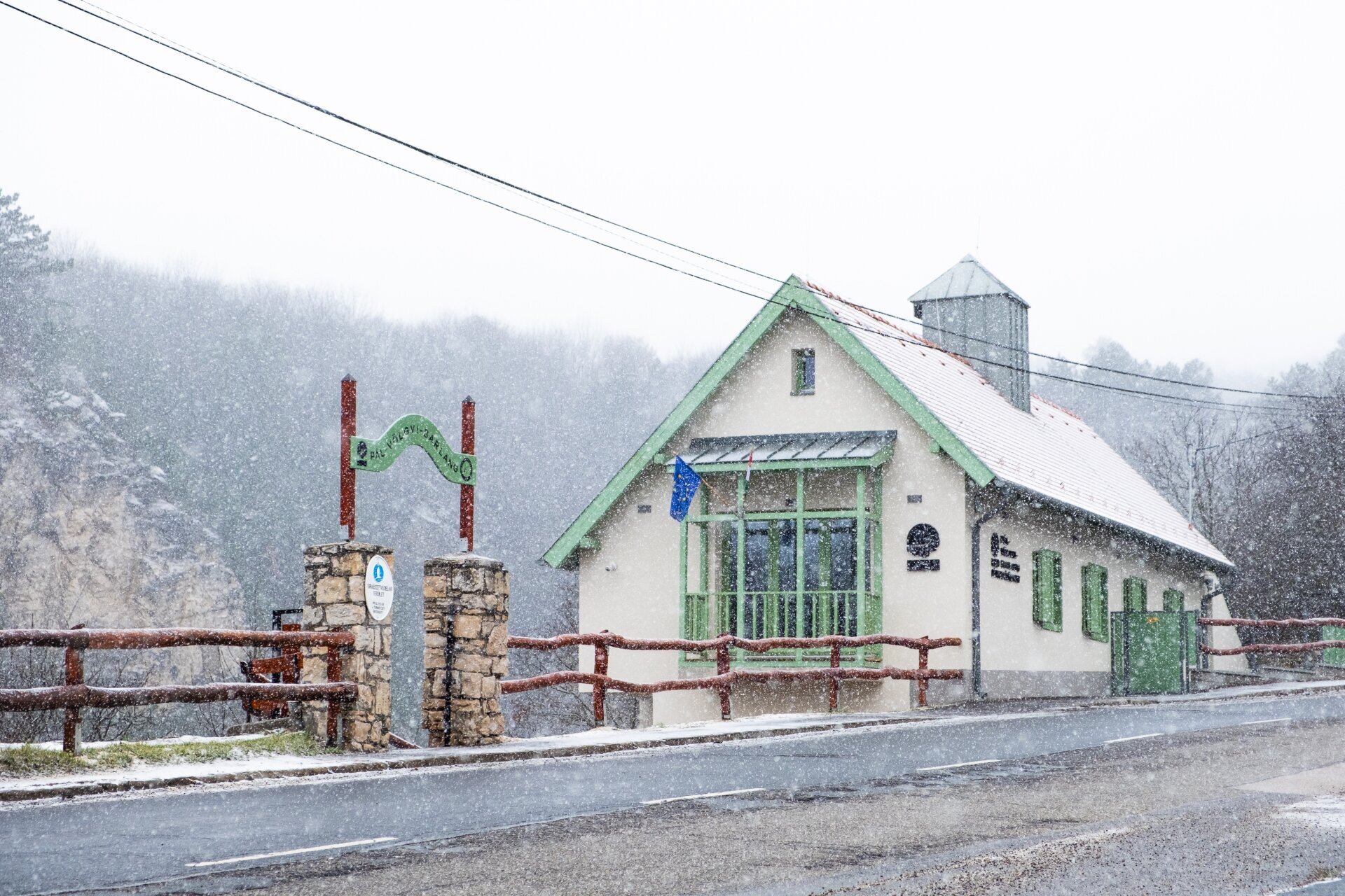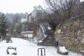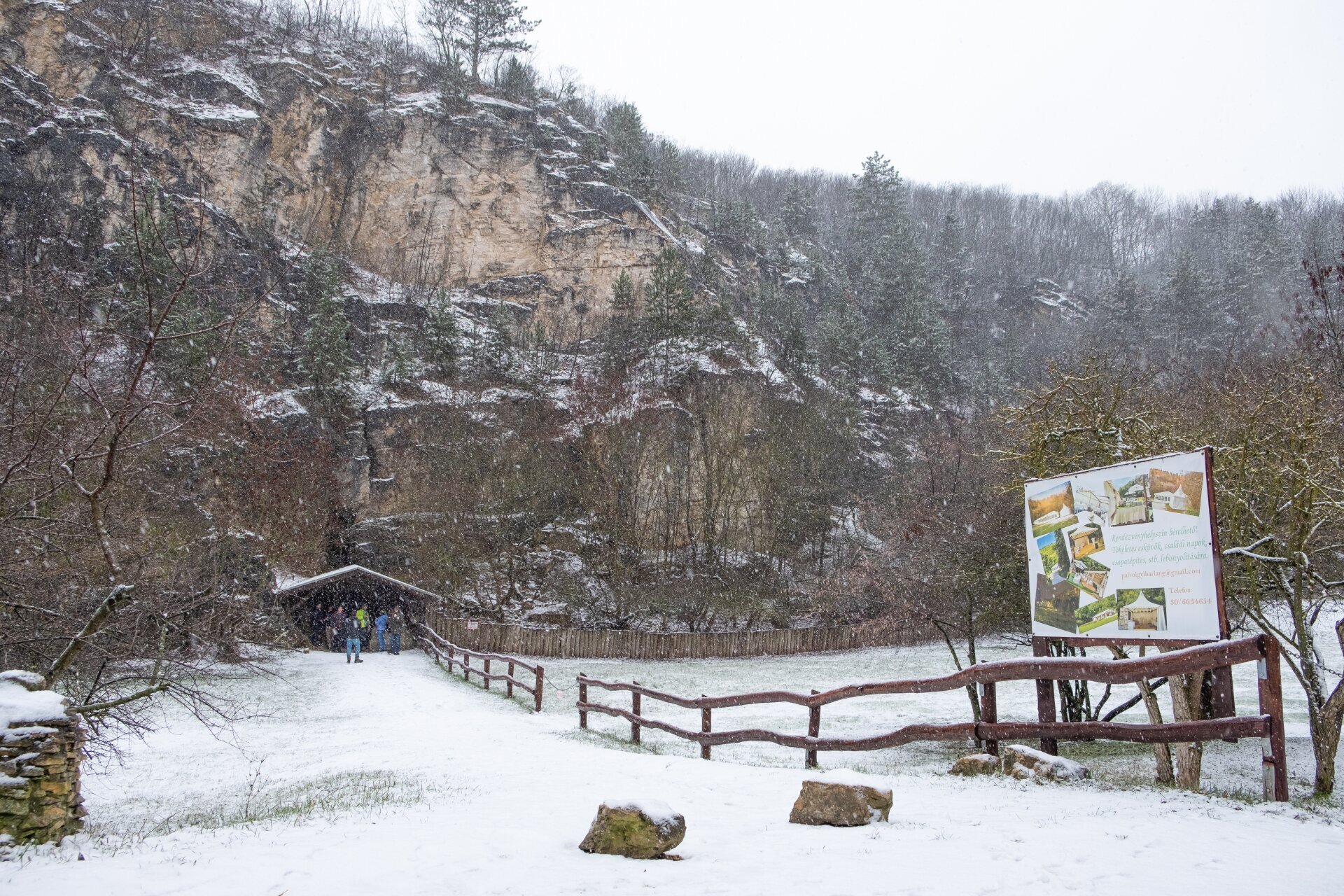 A barlang bejáratát is rejtő egykori Pál-völgyi-kőfejtő impozáns sziklafalakkal övezett, parkosított udvara téli köntösben is látványos
