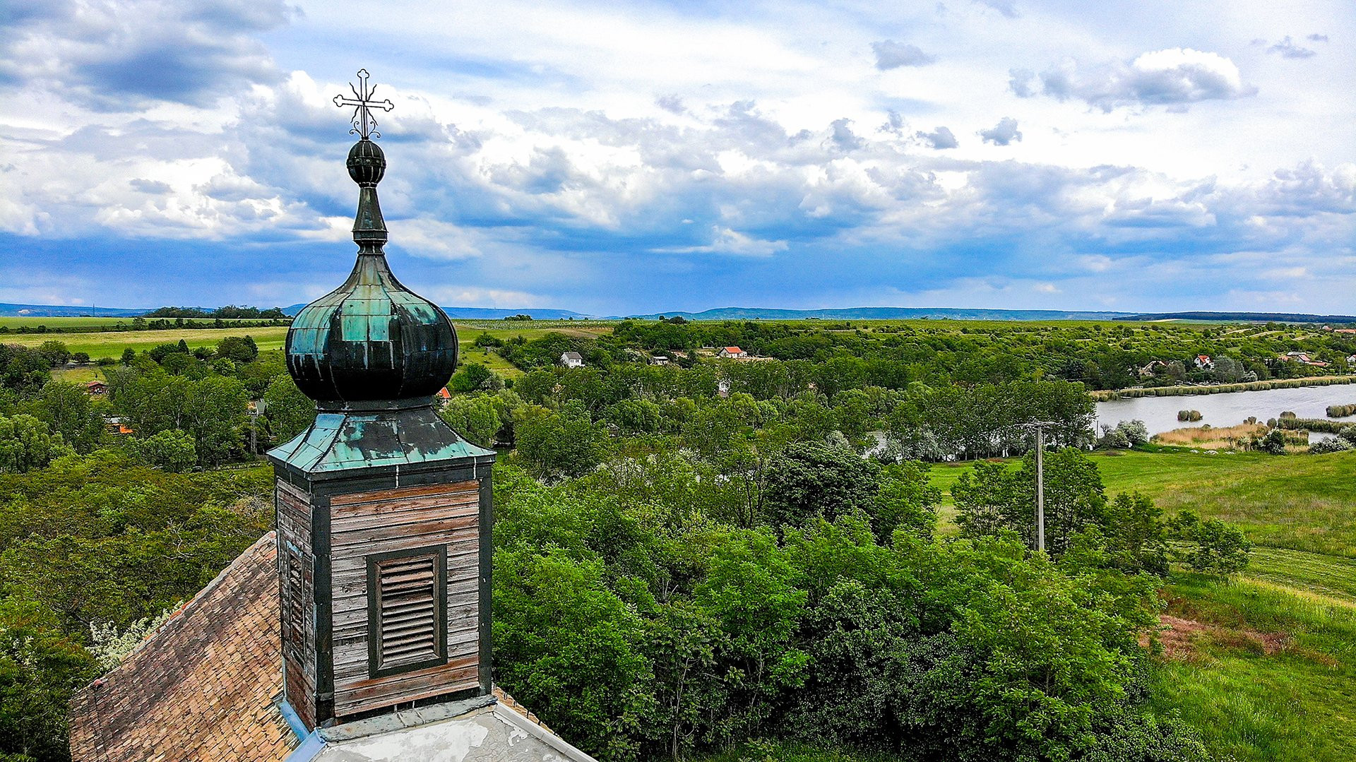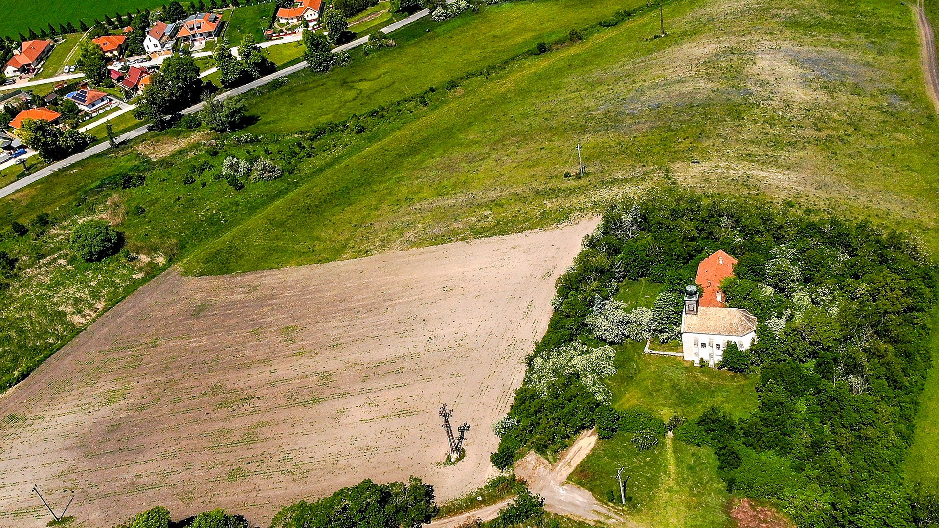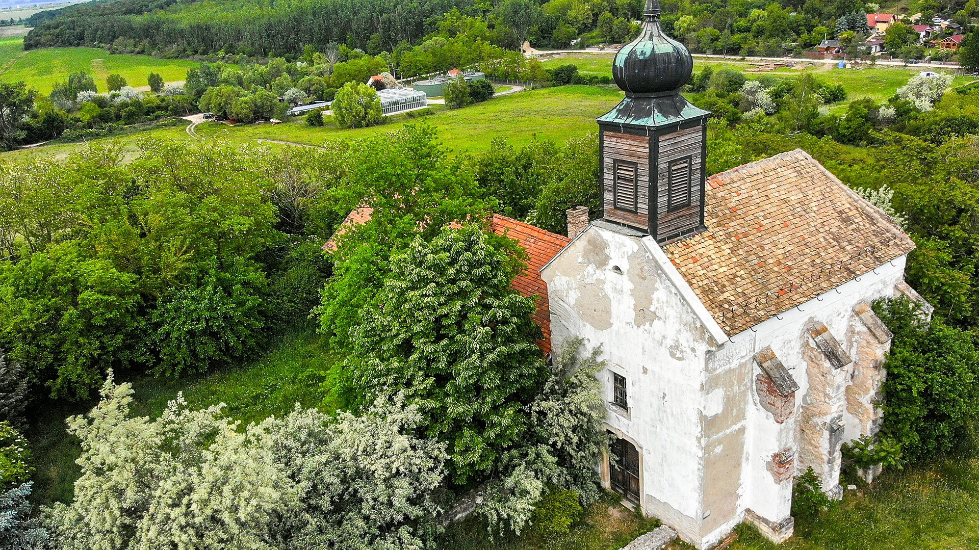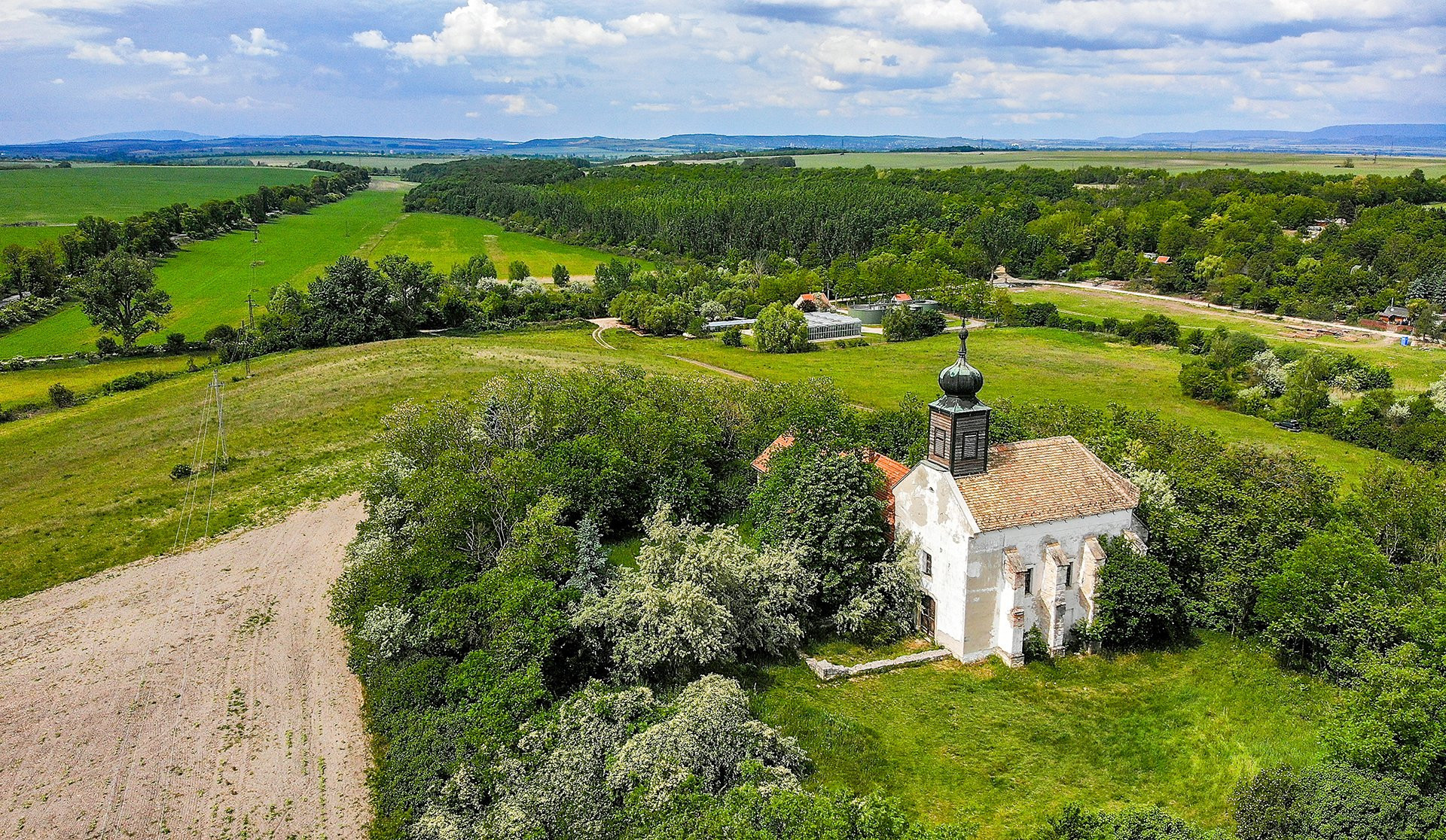A kápolna mögött található hangulatos Etyeki horgásztó madártávlatból