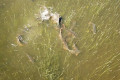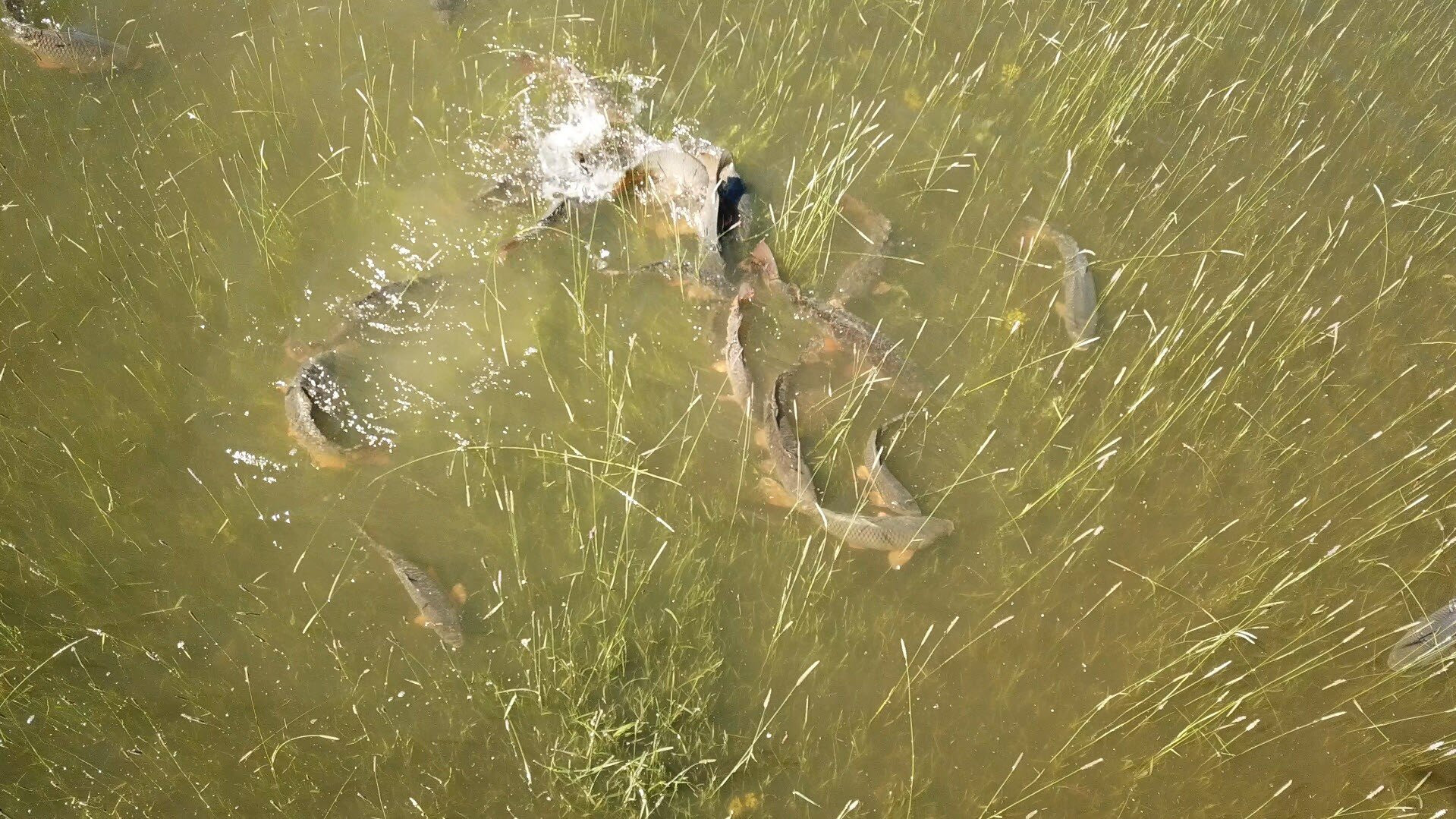 Az ártérben ívó pontyokat az se zavarja, hogy a hátuk is kilátszik már az alacsony vízben