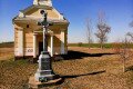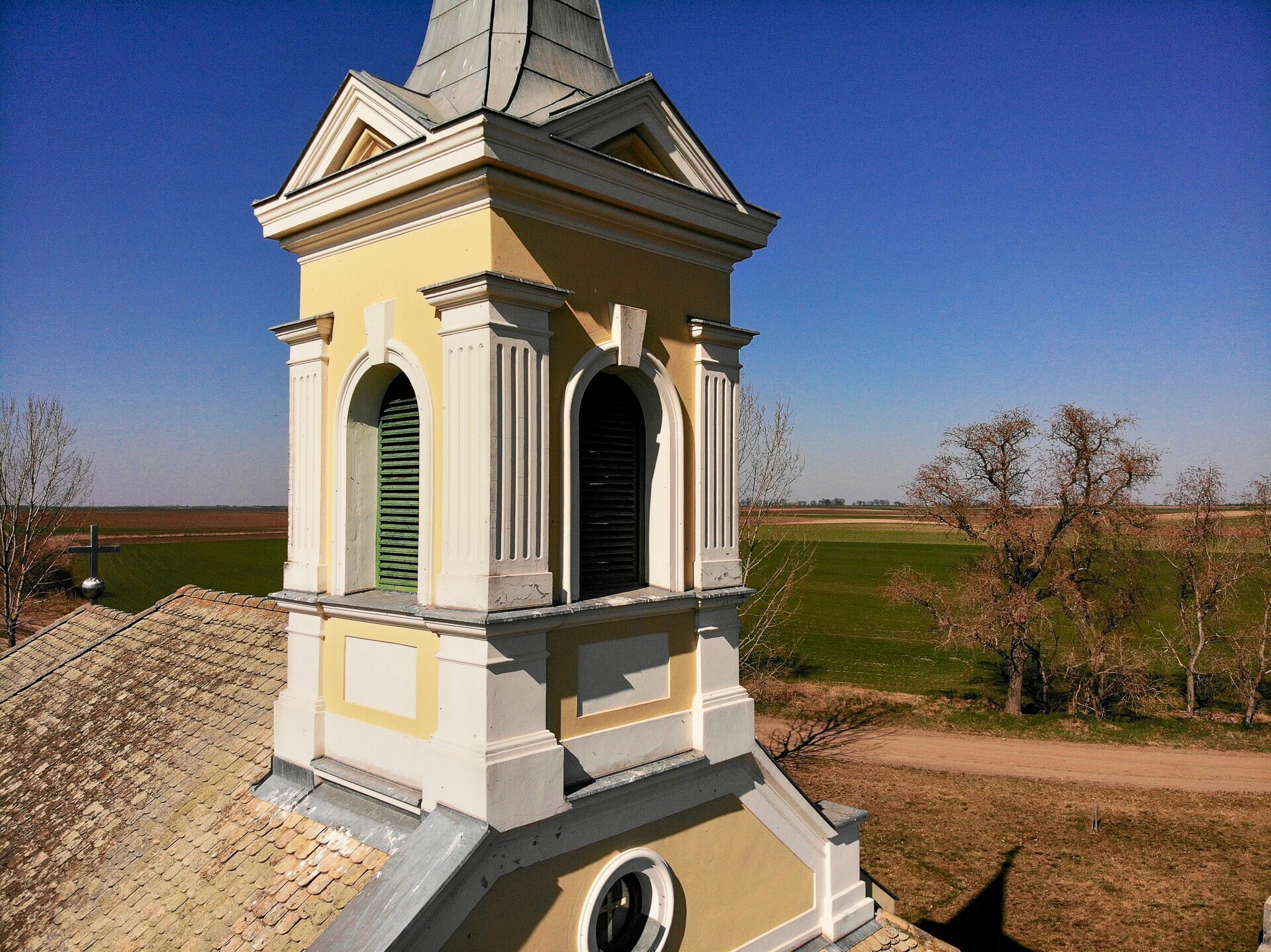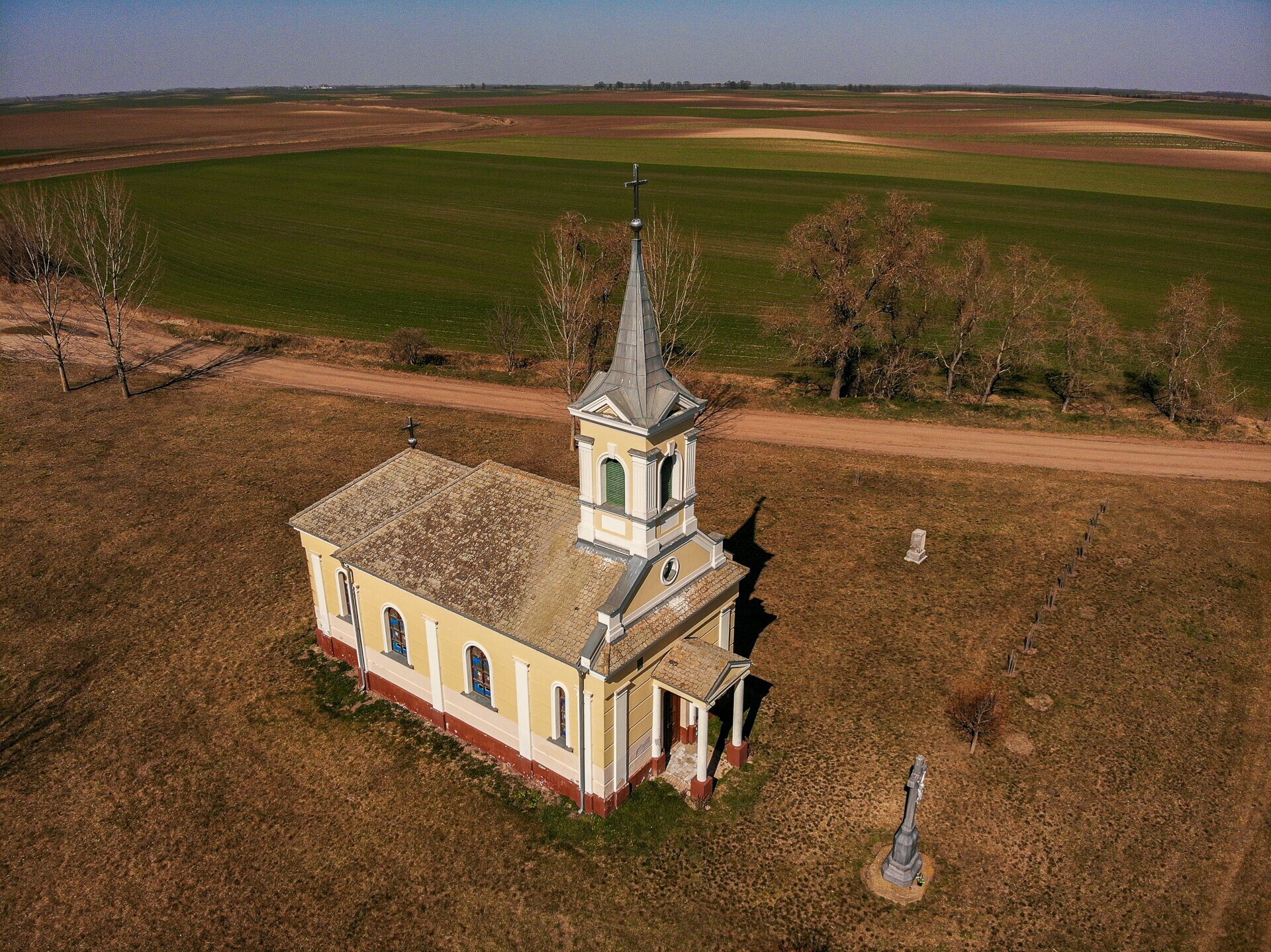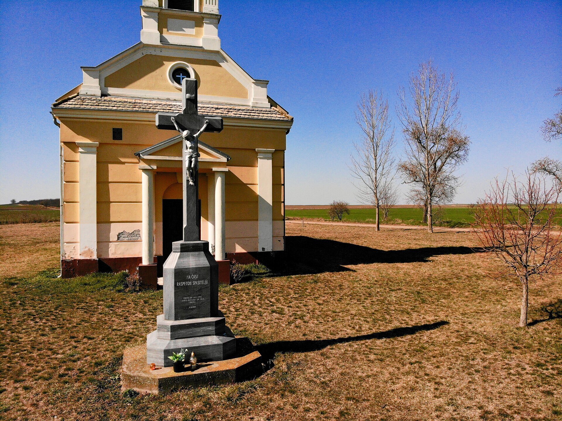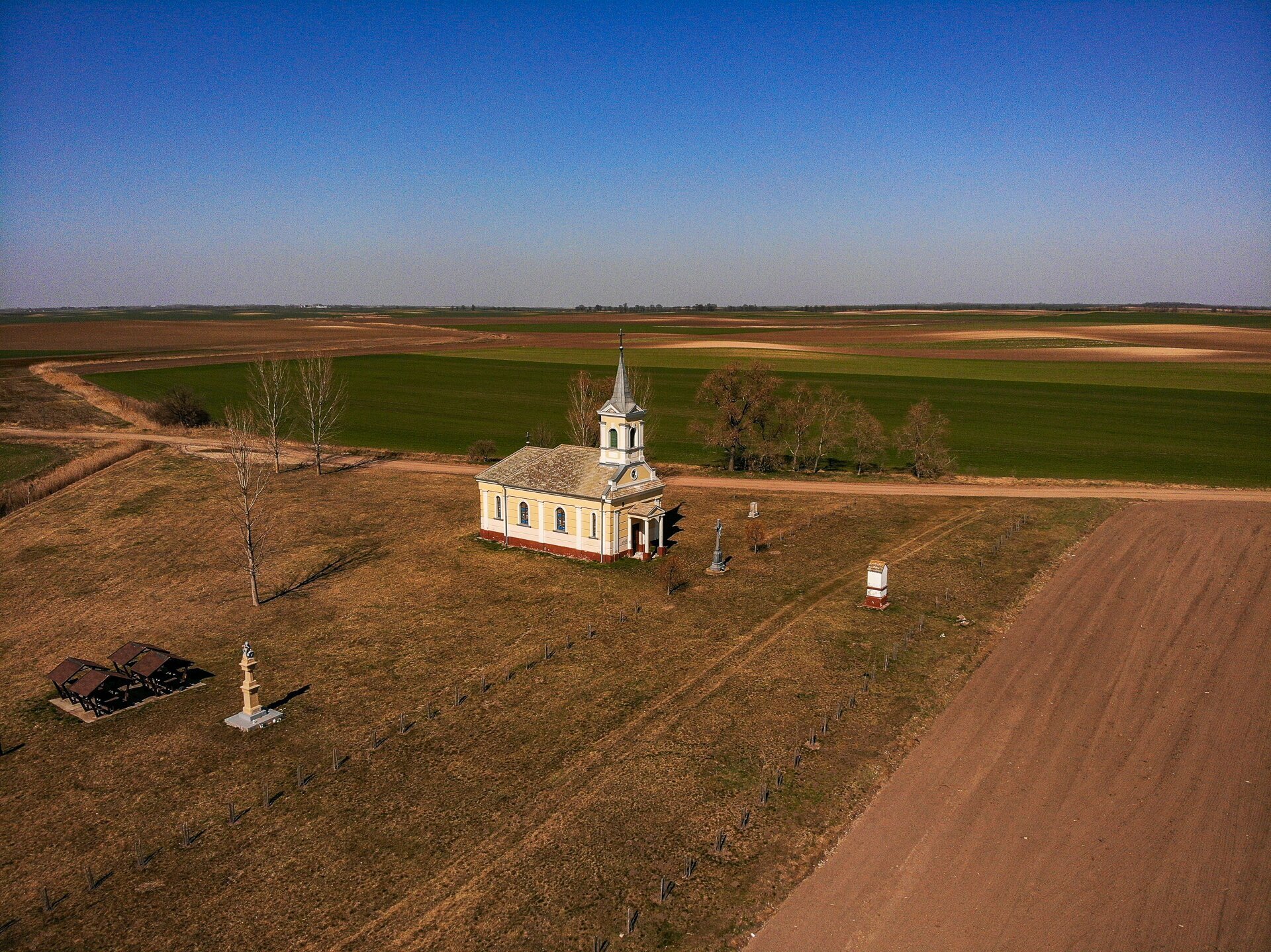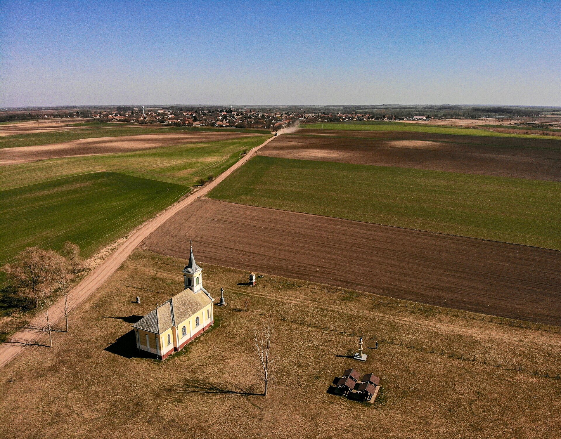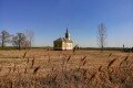 Vodica-kápolna a tájban, a háttérben Katymár házai tűnnek fel