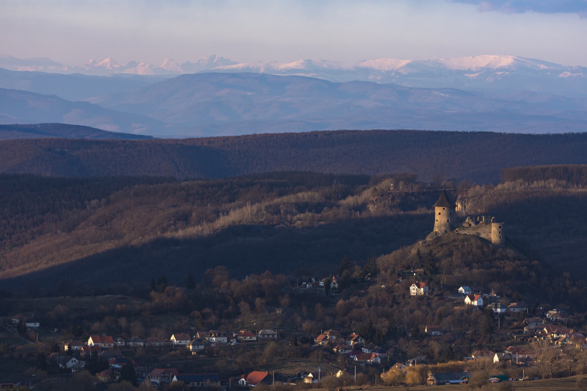 „A fénykép naplemente előtt készült, Salgó várából. Nem voltak kivételesen jók a körülmények, de a meglehetősen tiszta légkörnek köszönhetően így is látszik a hófödte Alacsony-Tátra és Magas-Tátra egy-egy része.”