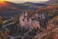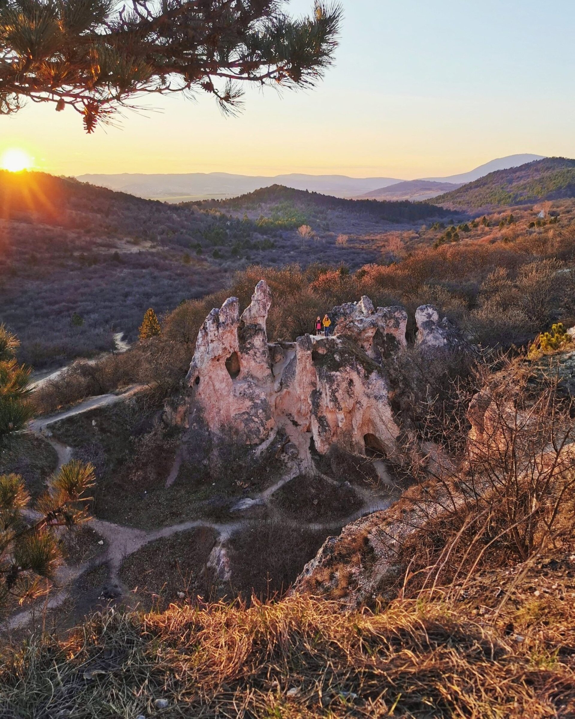 „A Pilisben a Teve-szikla környékén túráztunk, és sikerült azt a naplementében megörökíteni.A dolomit-sziklacsoport körül kisebb üregek is vannak a sziklafalban.”