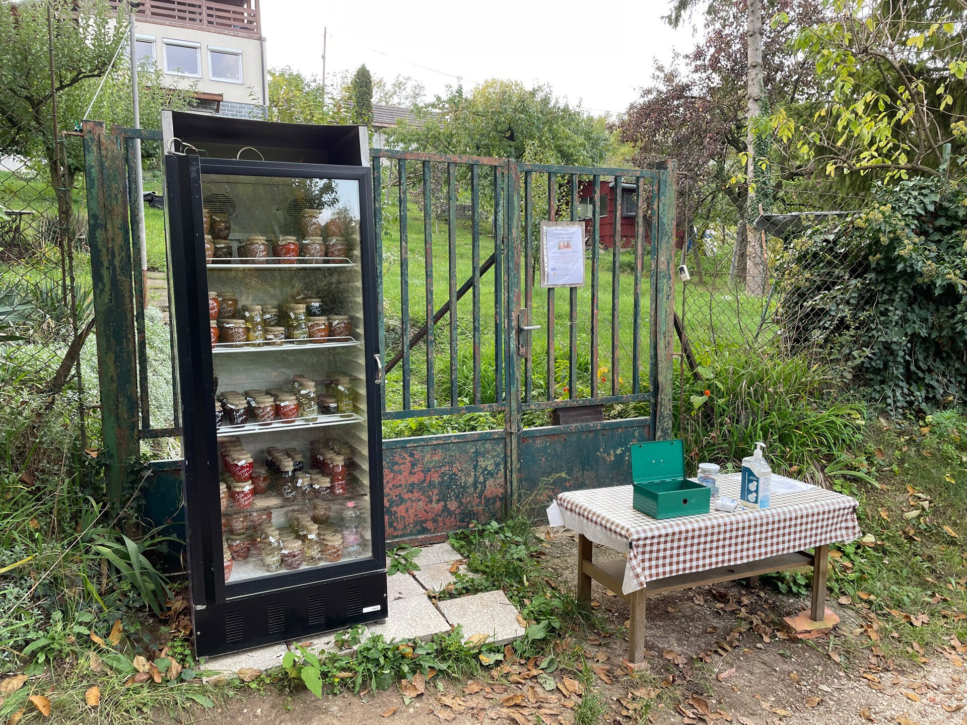 Jó látni, hogy működnek ilyenek is nálunk: ez egy becsületkasszás bolt, az árú a nyitott szekrényben, és egy befőttes üvegből még visszajárót is tudunk kivenni, ha nem tudunk pontos összeget beletenni