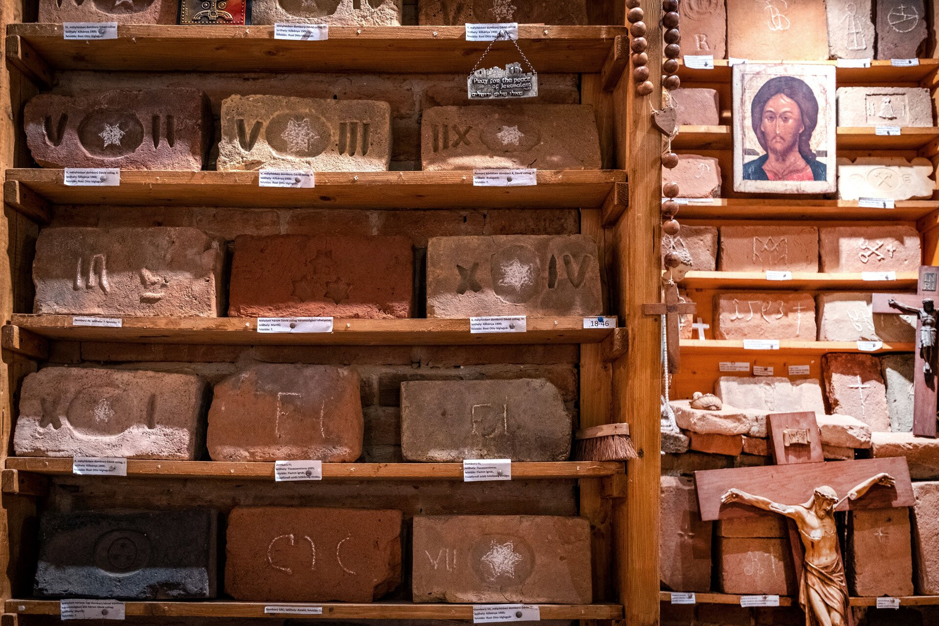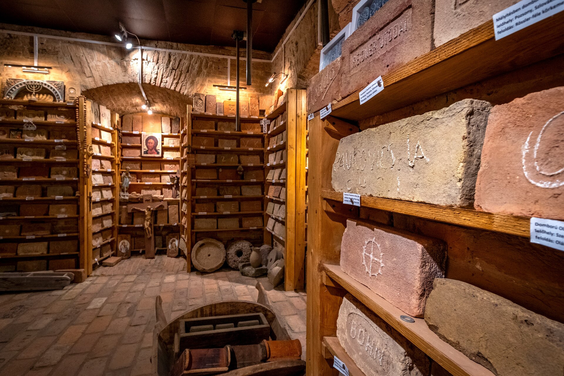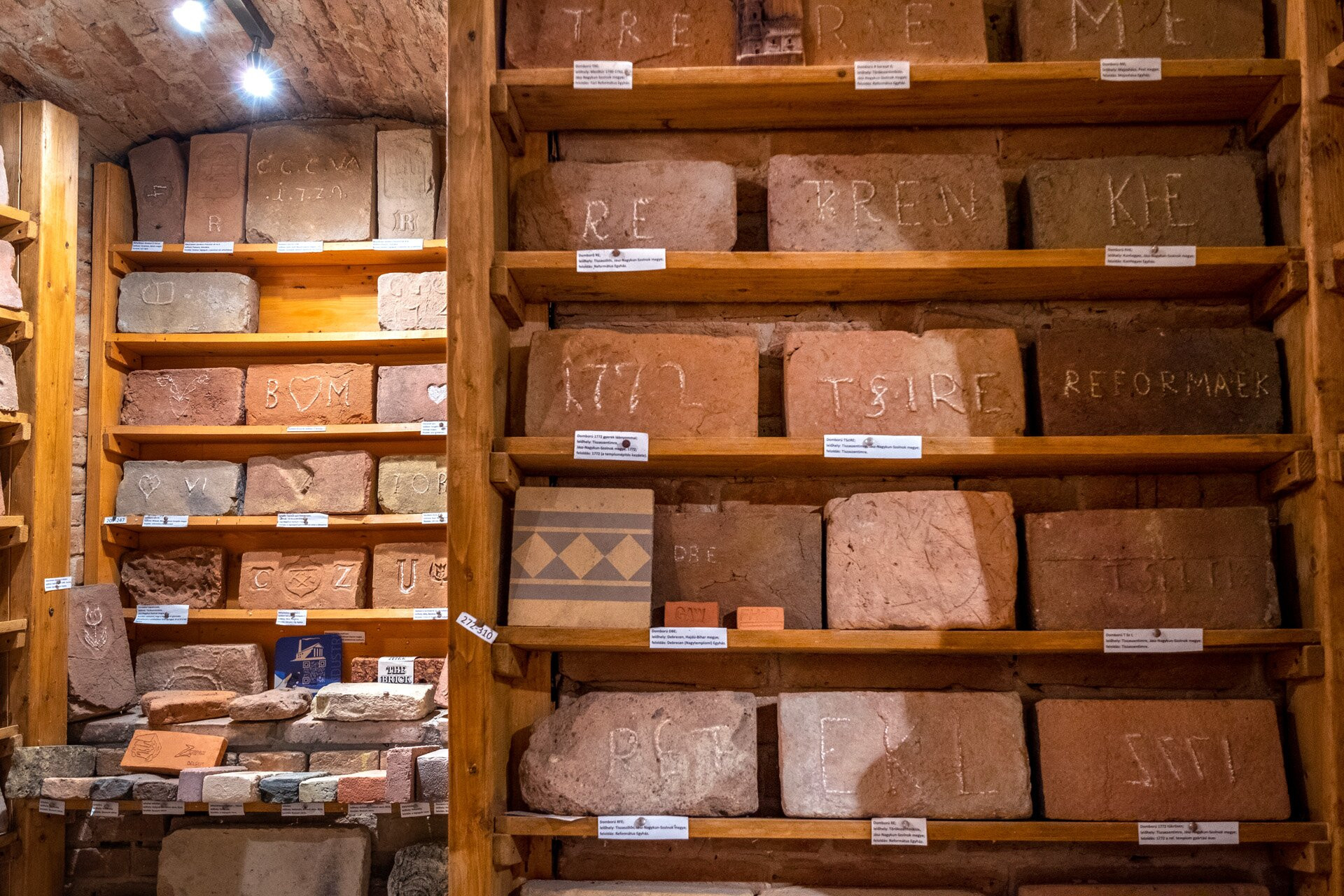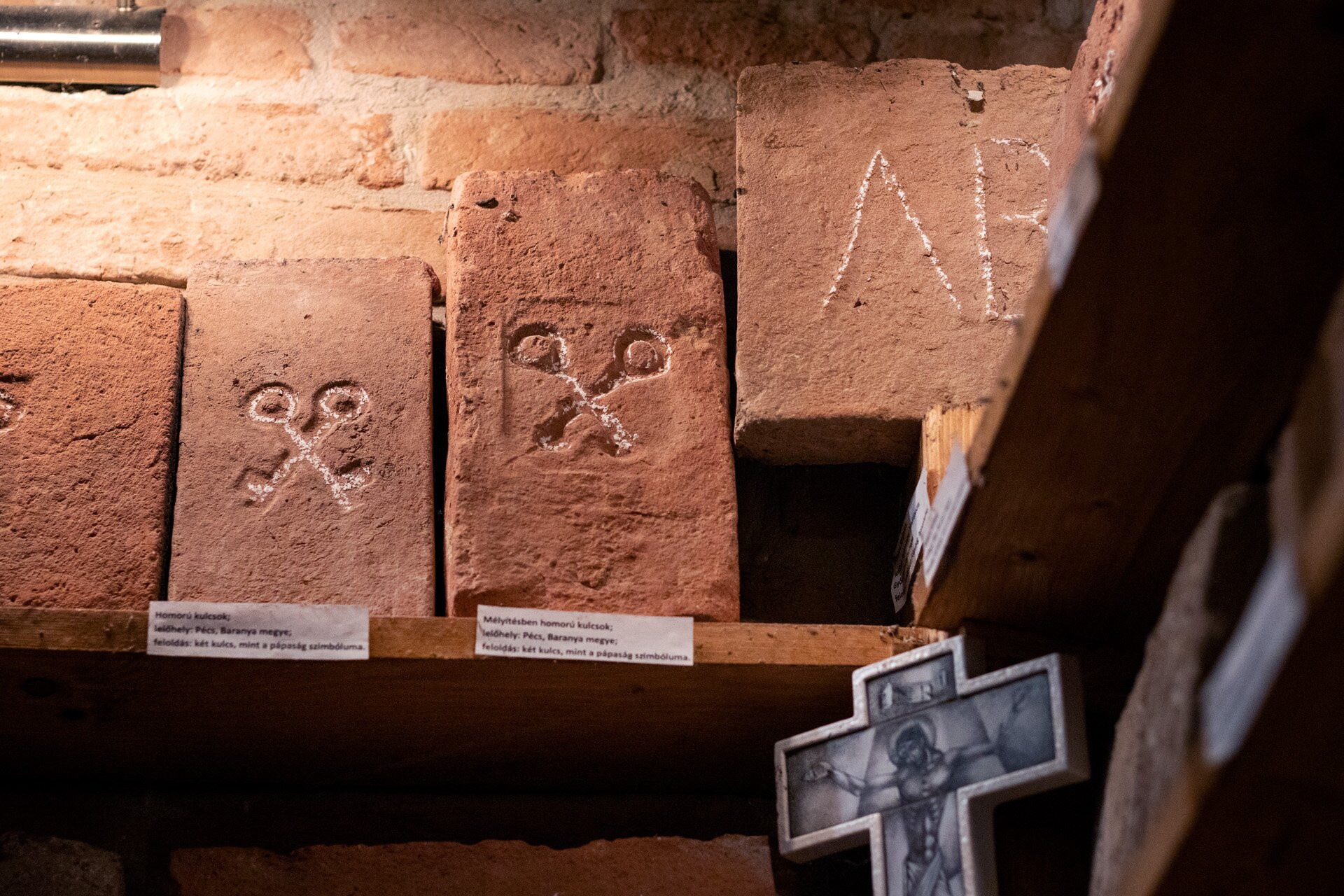 A zsidóság téglái közül az 'FI' monogrammal ellátott darabok Flamm Ignác téglái, háttérben pedig már a katolikus egyház relikviái