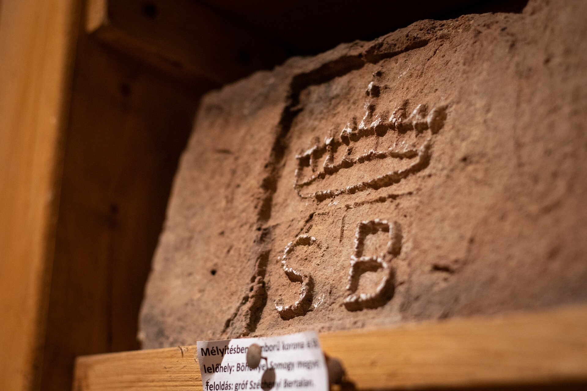 Gróf Széchenyi Bertalan téglája, monogramja fölött pedig a kilencágú korona jelzi nemesi rangját