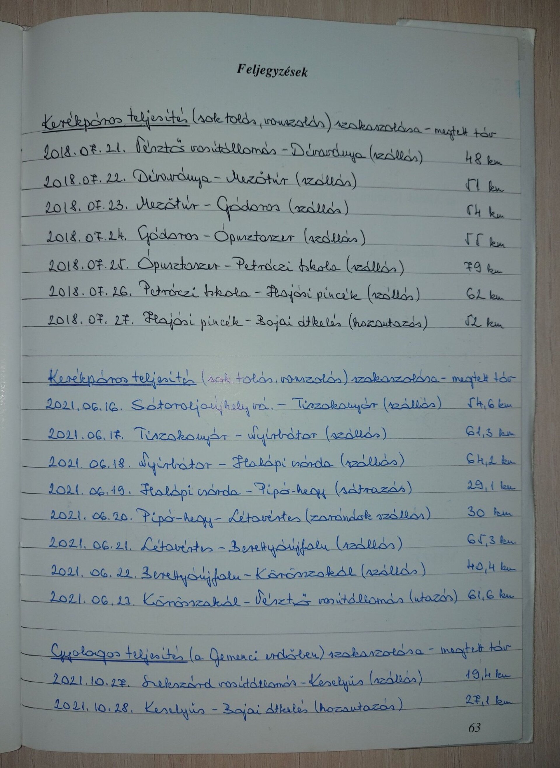 Érdekes példa 2: Egy példásan vezetett Alföldi Kéktúra füzet összefoglalója. Itt kell megemlíteni azt, hogy a kerékpáros teljesítés csak az Alföldön és csak 2021. június 30-ig volt megengedett.