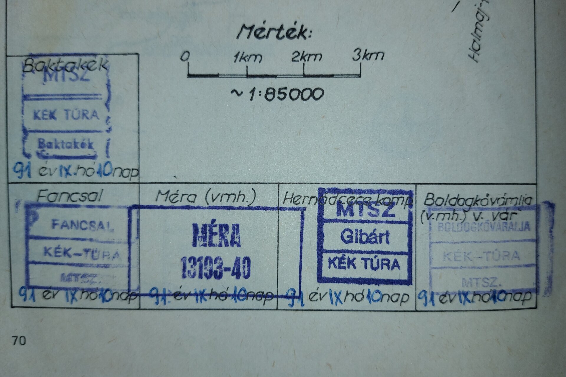 Jó példa 2: Jó régi OKT füzet, ahol jól látható, hogy nem csak a hivatalos MTSZ bélyegzők használhatók igazolásra, hanem bármilyen más is, ha rajta van a település neve (itt pl. Méra).