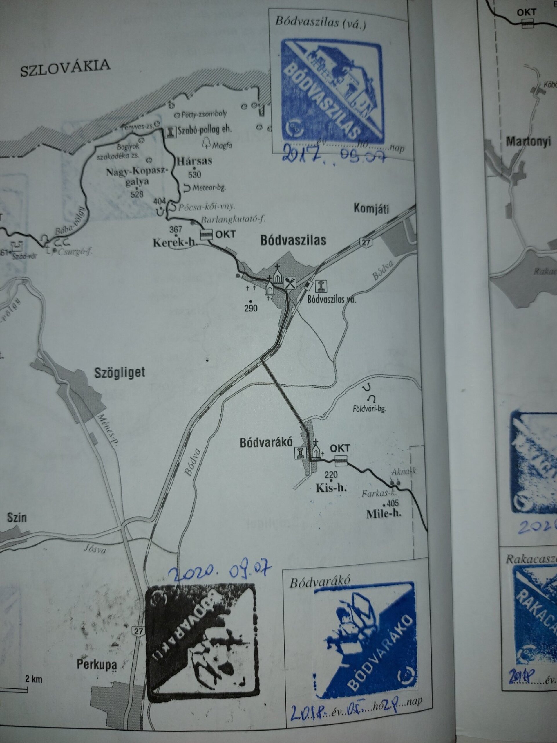 Jó példa 2: Régi típusú (2017. előtt kiadott) igazolófüzetekben is lehet kéktúrákat igazolni, de ott az útmegszakításoknál kétszer kell bélyegezi, mint itt Bódvarákón.