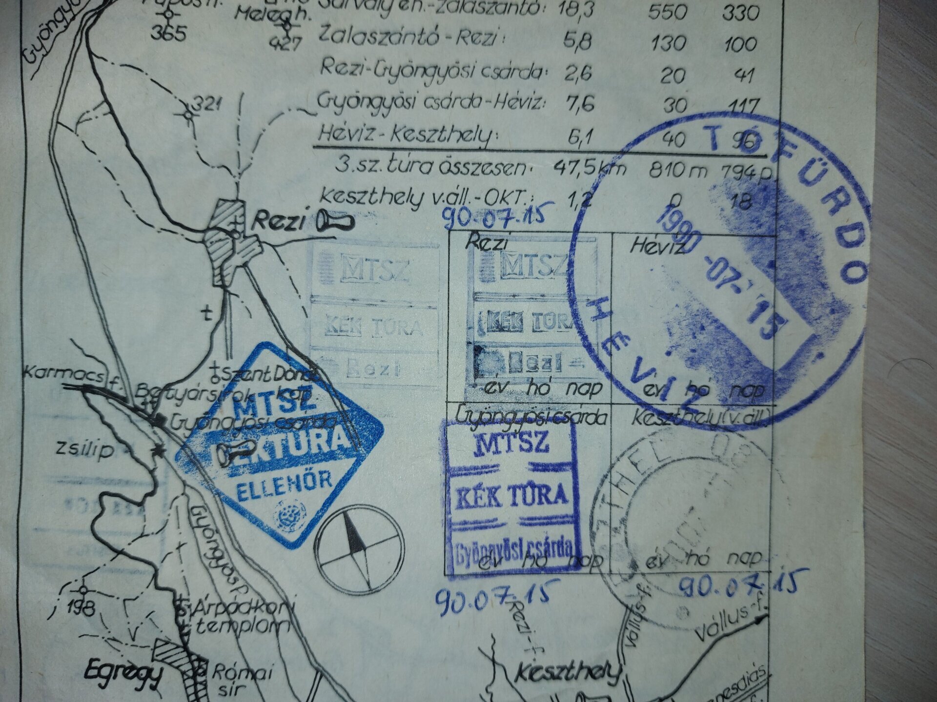 Jó példa 3: Ez is régi OKT füzet, ahol a túrázó nem csak a hivatalos MTSZ vagy MÁV bélyegzőt használta (itt Hévíznél). Ez is elfogadható, ha rajta van a település neve.