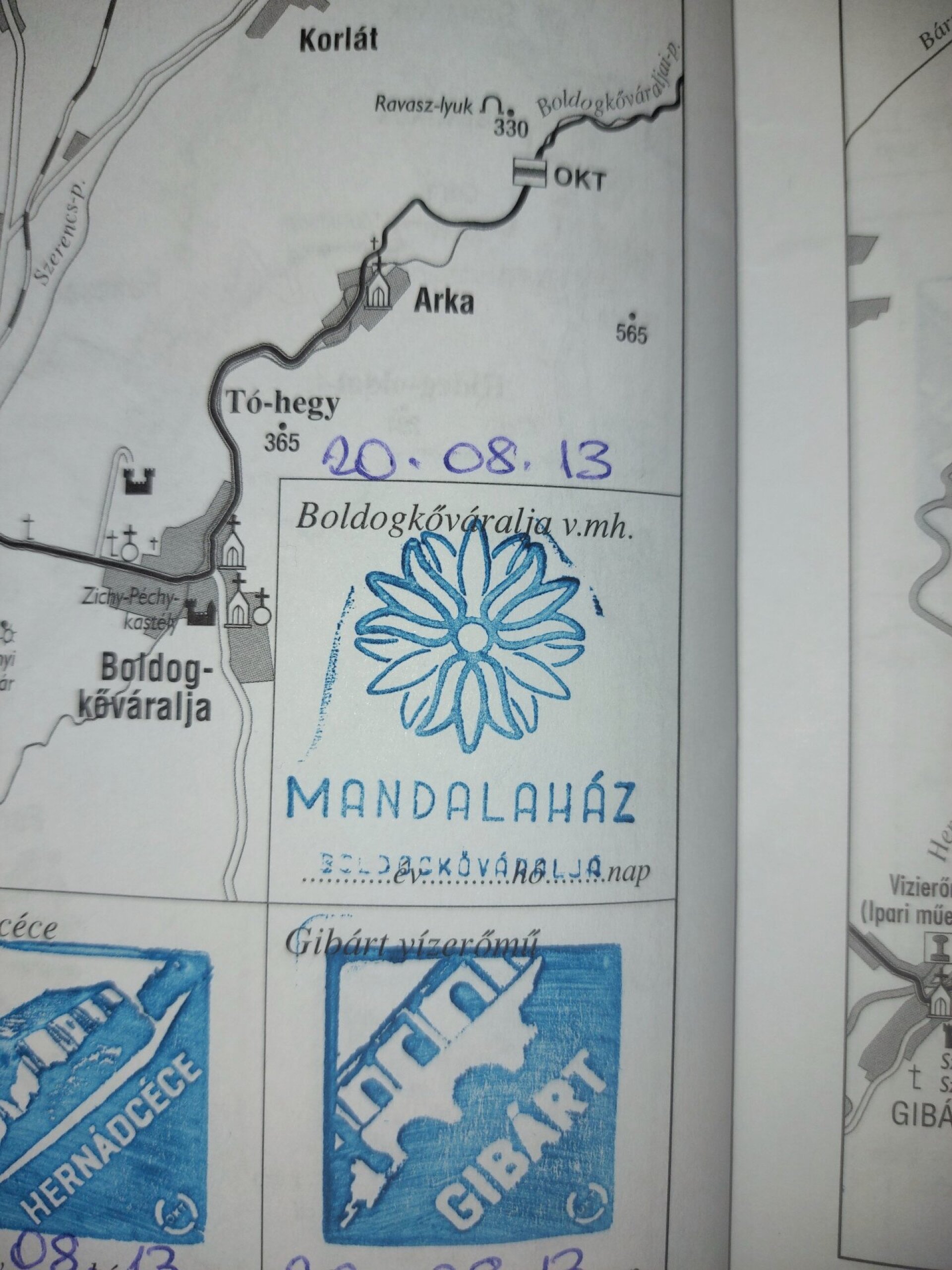 Jó példa 2: A régebbi típusú igazolófüzetekben így fest egy olyan oldal, ahol két útmegszakítást is igazolnak a dupla bélyegzések. Ezt így várja el a kéktúrák hivatalos kiírása ebben a füzetben.