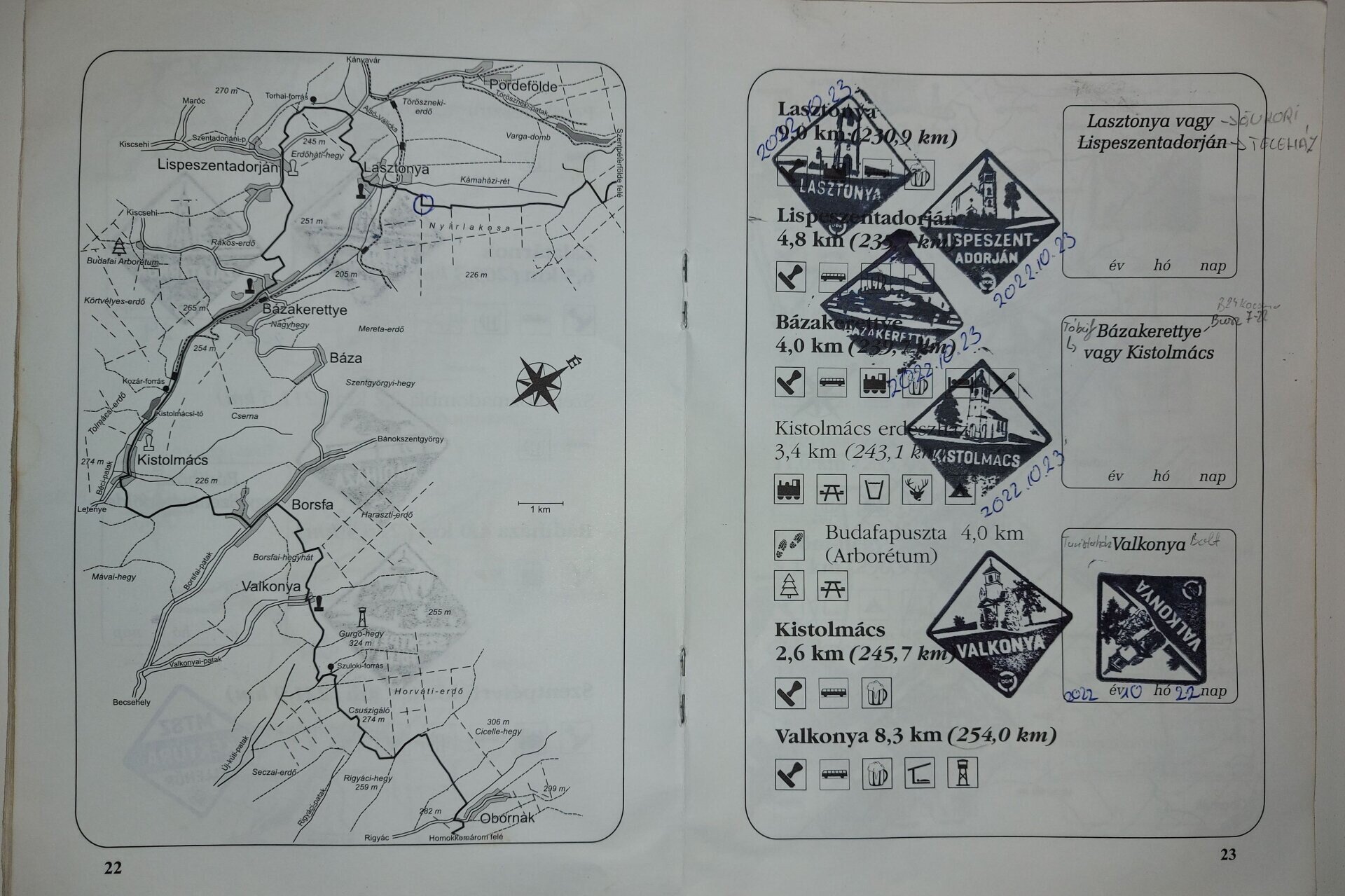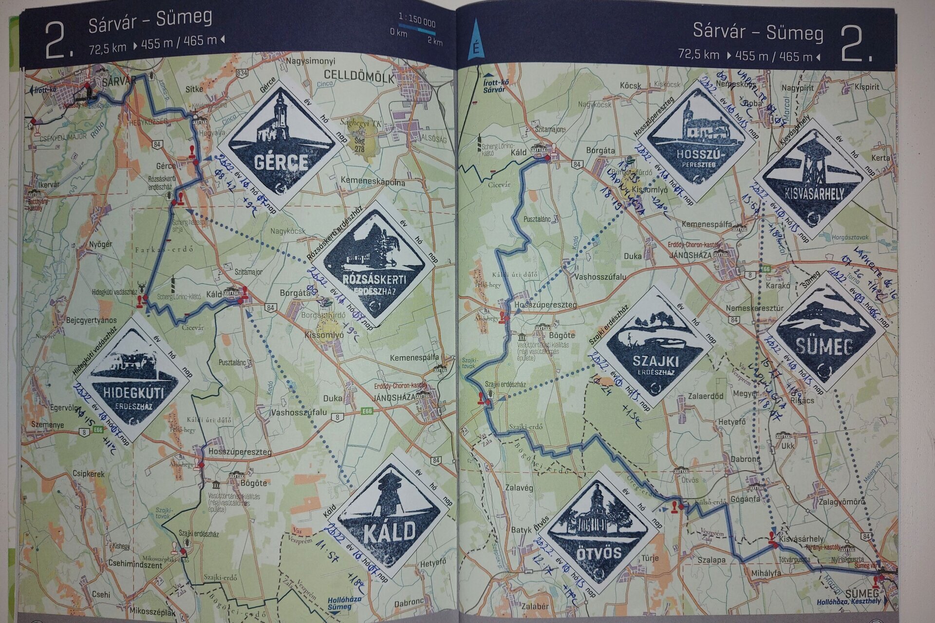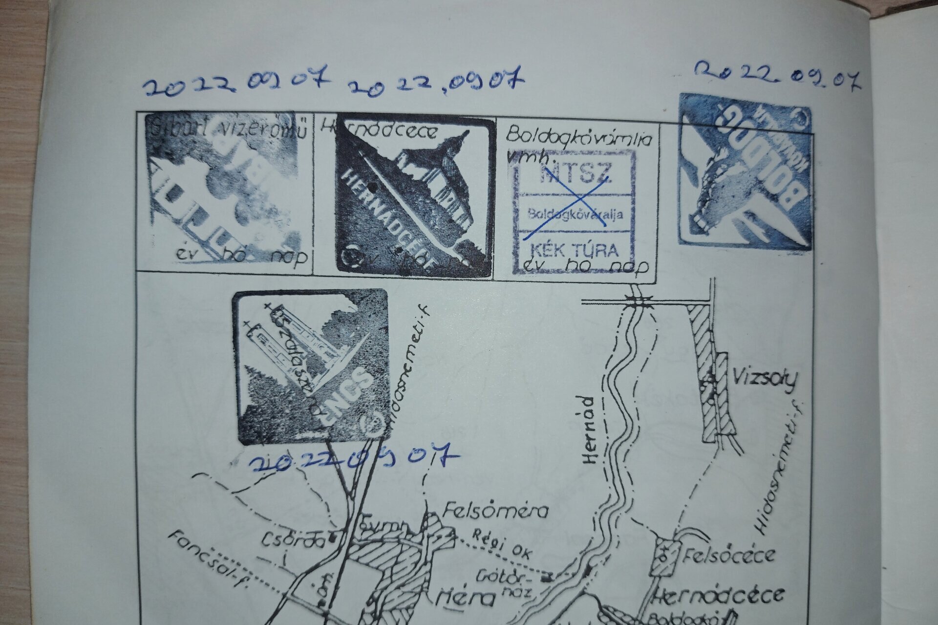 Jó példa 1: Ez azért érdekes és jó példa, mert a túrázó a régi füzetbe is beütötte a ma már elvárt encsi bélyegzőt, ahogy kell. Valamint a régi boldogkőváraljai bélyegző helyett a 2022-ben ott elérhetőt is beütötte. Az a bizonyos áthúzott bélyegzés 2022-ben már rég nem volt elérhető.