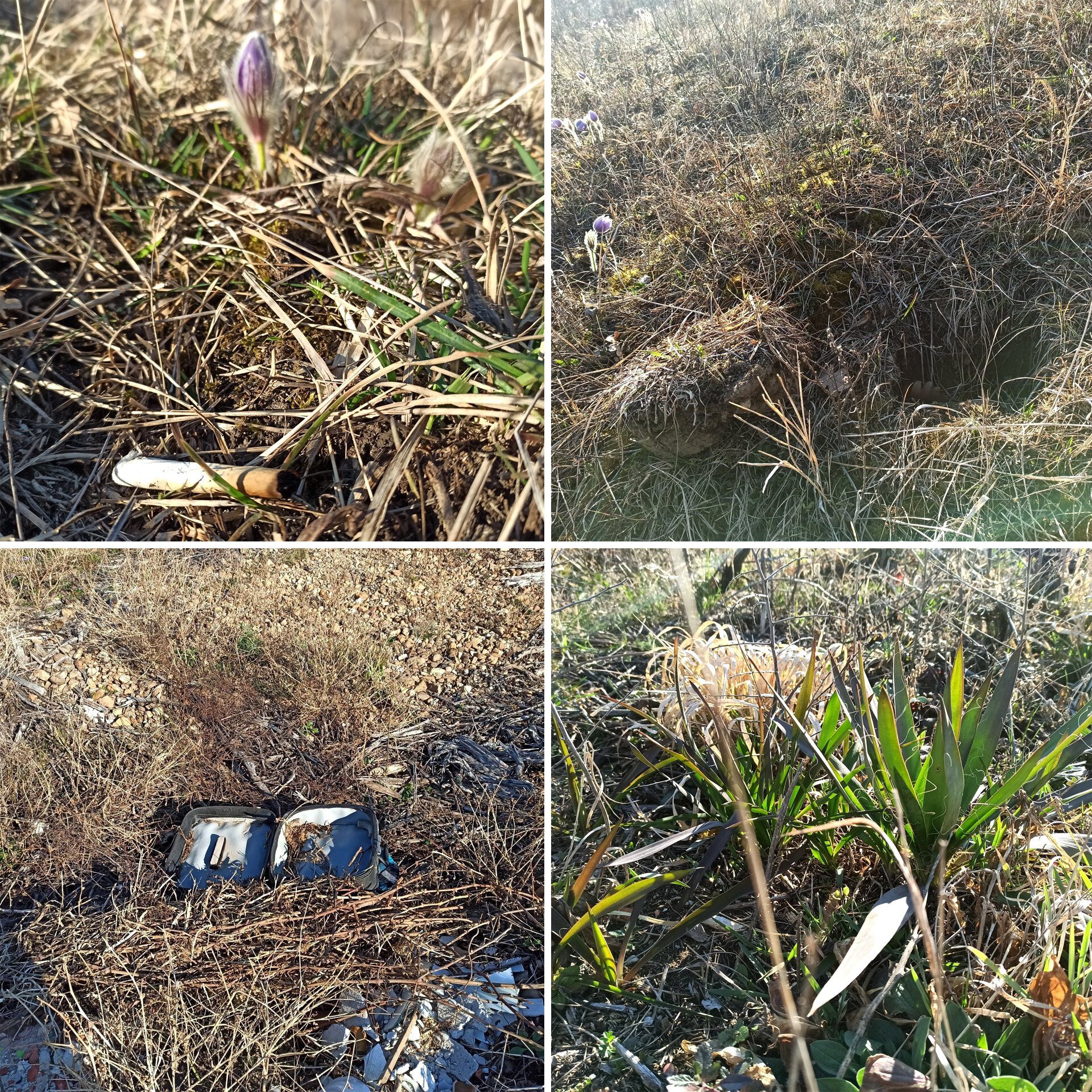 Veszélyeztető tényezők: szemetelés (bal oldali képek), kiásás (bal fent), a zöldhulladék miatti nem őshonos fajok elszaporodása, például pálmaliliom (bal lent)