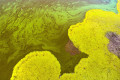 Tomi másik fotója drónnal készült, és elsőre úgy tűnhet, nem jó helyre pályázott. De ha jól megnézitek, a bal felső sarokban hattyúk úszkálnak a vízen. Az intenzív zöld színt a vízben tavasszal elszaporodott algák adják. A madarak csíkokat hagynak maguk után, ahogy úszkálnak benne, a szél pedig különleges örvényeket formál a vízben.