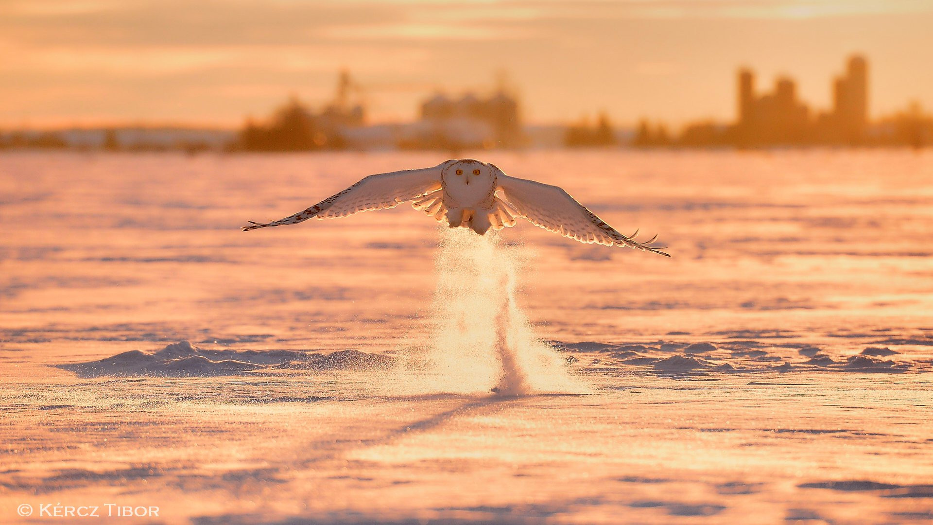 „Telente a zord, sarkvidéki költőterületeikről a hóbaglyok lehúzódnak Kanada déli, tanyákkal tarkított mezőgazdasági vidékeire, ahol a csűrök, magtárak, istállók és gabonatárolók közelében ilyenkor is megtalálják zsákmányállataikat, a pockokat és egereket. Naponta több órát kóboroltunk a 40-50 cm-es hóval borított mezőkön, -15 és -20 fokban. A két hét alatt csak egyetlen egy alkalommal volt gyönyörű napfelkelténk. Ekkor, a reggeli aranyóra ellenfényében készült a képem, amelynek hátterében egy közeli tejelőszarvasmarha-tenyészet és egy tejüzem sziluettje látható.”