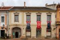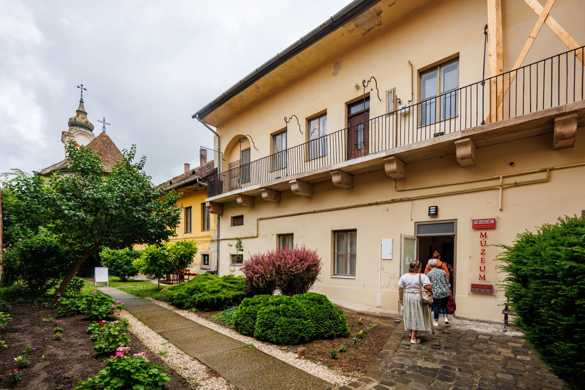 A Memento Mori kiállítás bejárata a Tragor Ignác Múzeum udvarán, a háttérben a görög ortodox templom tornya