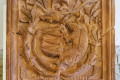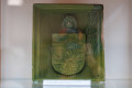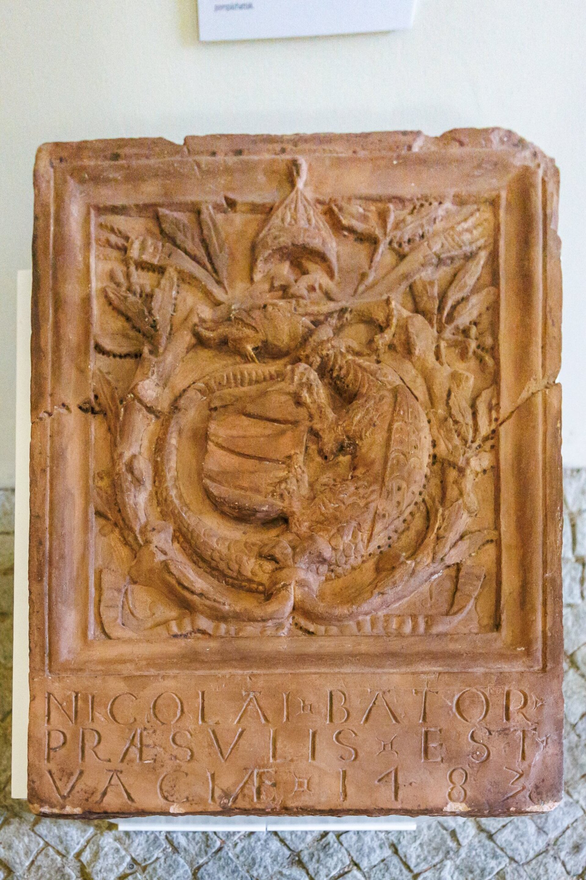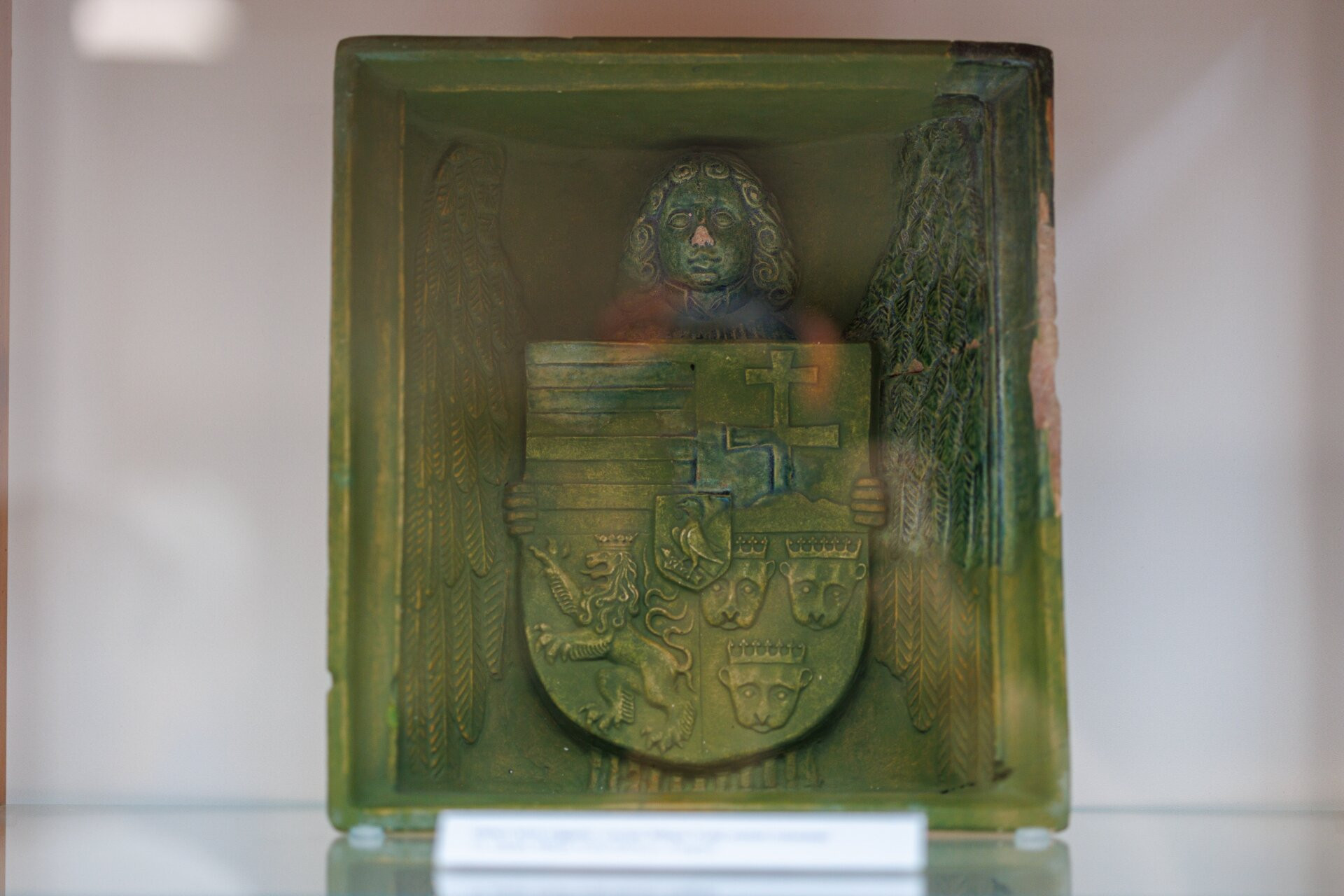Míves kidolgozású, díszes reneszánsz cserépkályha egy darabja a Báthori Miklós és kora időszaki kiállításon