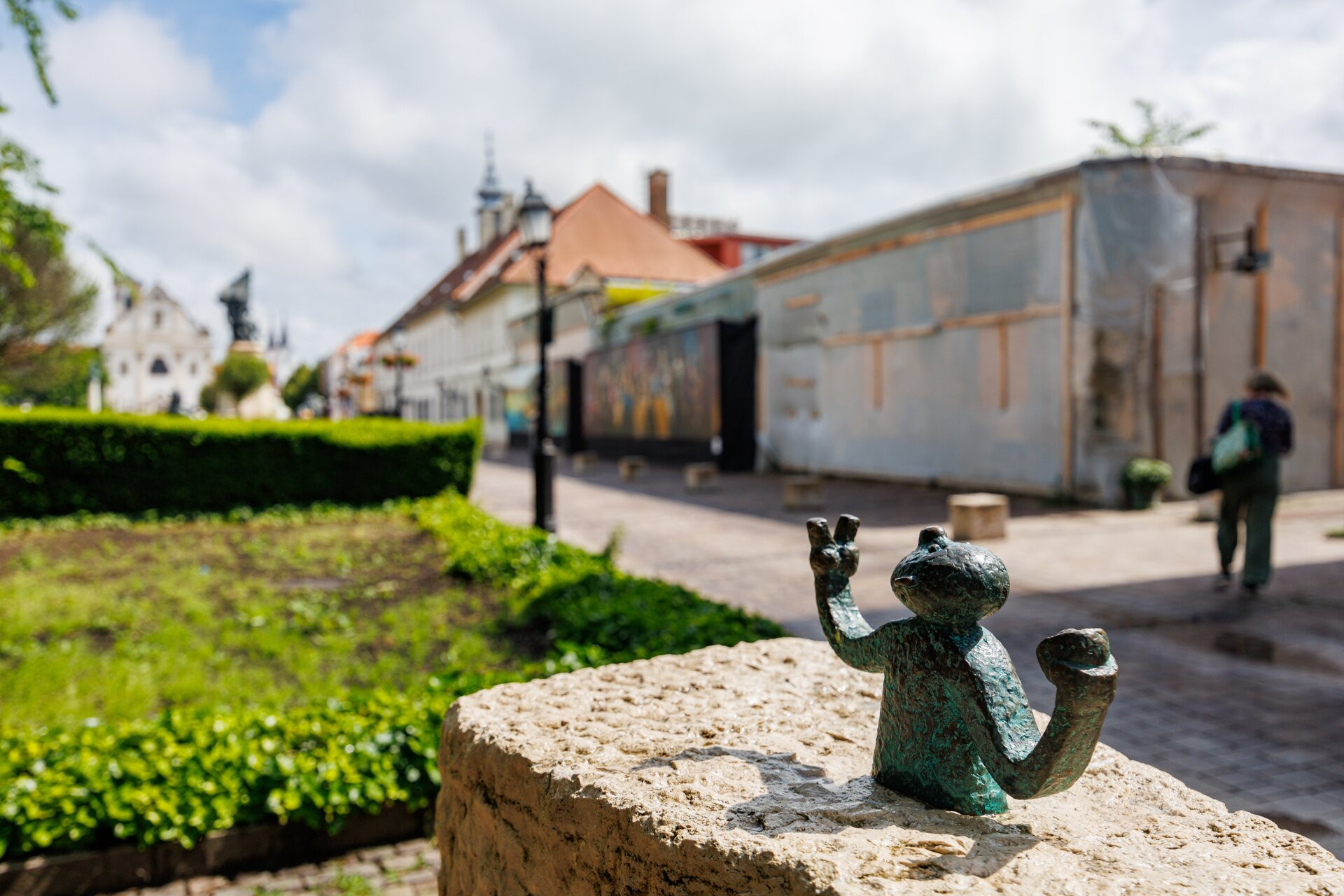 A főtéren a Pannónia Ház előtt található Csúzli, a harmadik váci Kolodko-miniszobor