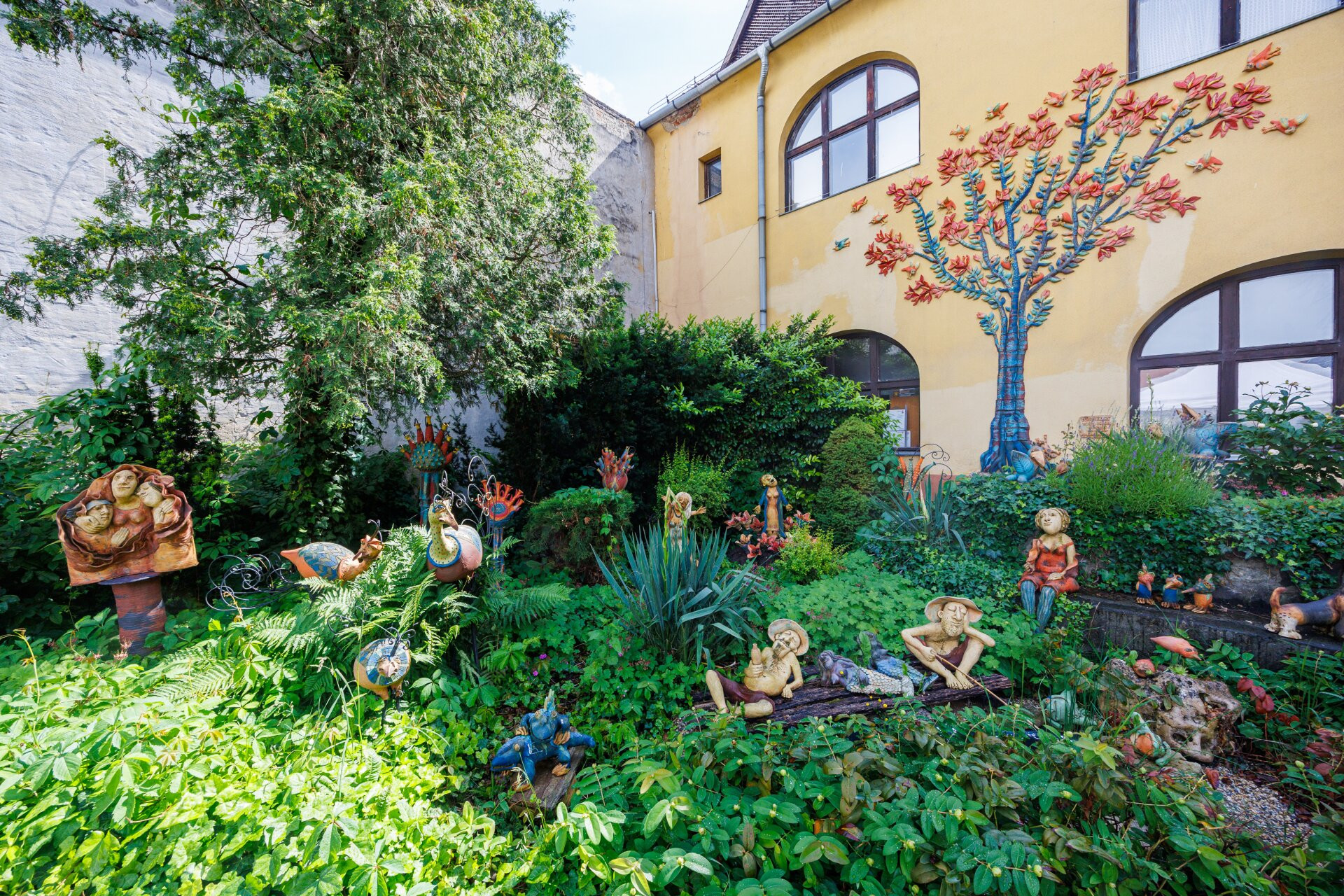 A Tündérkert bohókás kis szobrai az Életfával Vertel Andrea kerámikusművész alkotásai, és a Pannónia Ház udvarán tekinthetők meg