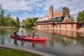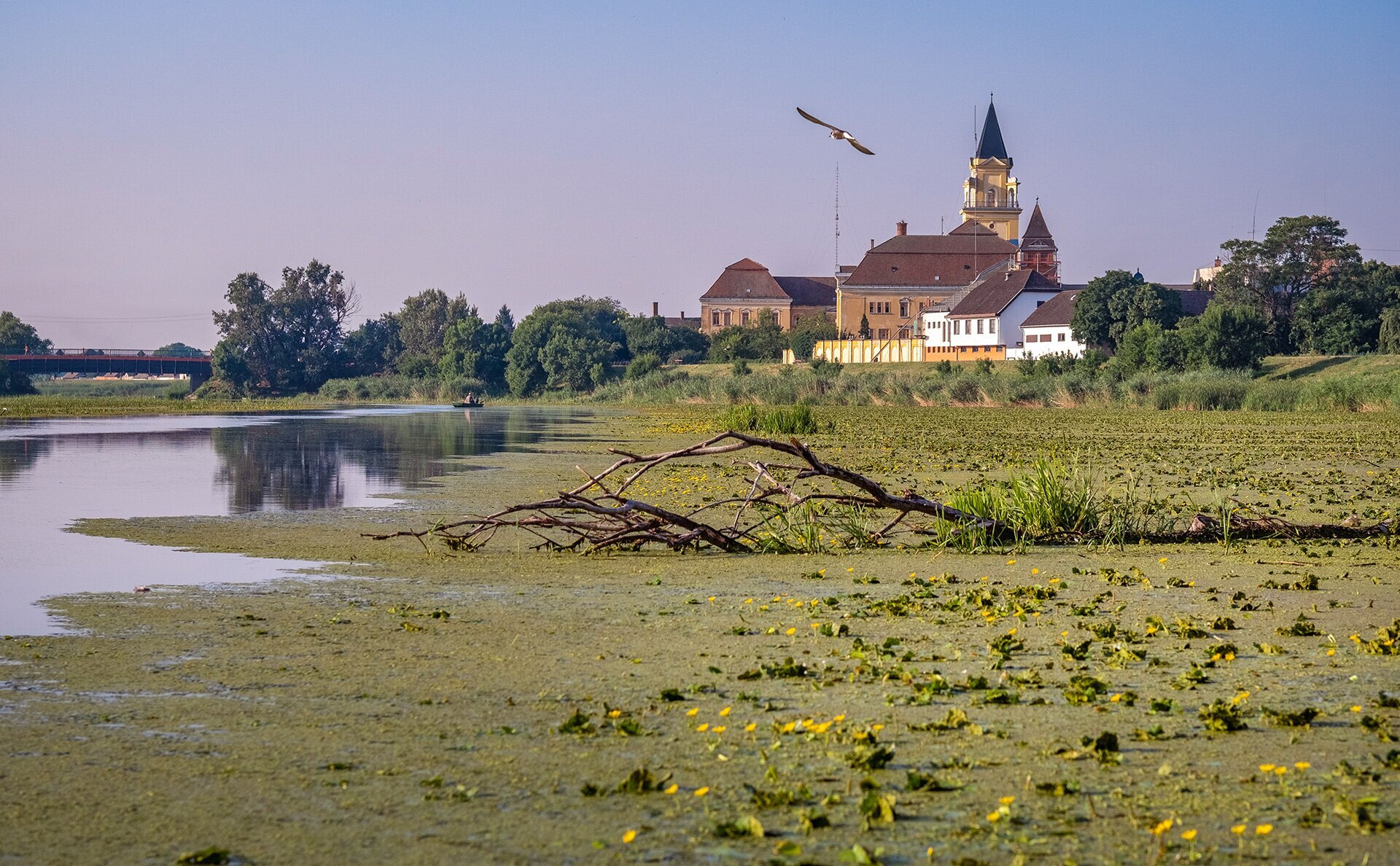 A Hortobágy-Berettyót beborító hínártársulás nélkülözhetetlen a szerkők fészkeléséhez. A háttérben a mezőtúri Polgármesteri Hivatal látható