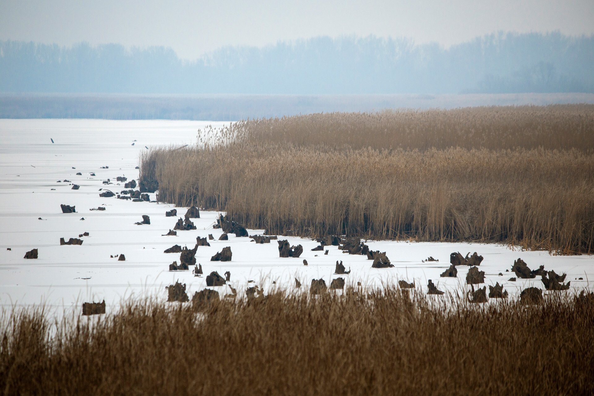 Az alacsony vízszint miatt felszínre kerülő fatuskók pedig, amelyek a tó előtti időkre emlékeztetnek, még izgalmasabbá teszik e téli panorámát.