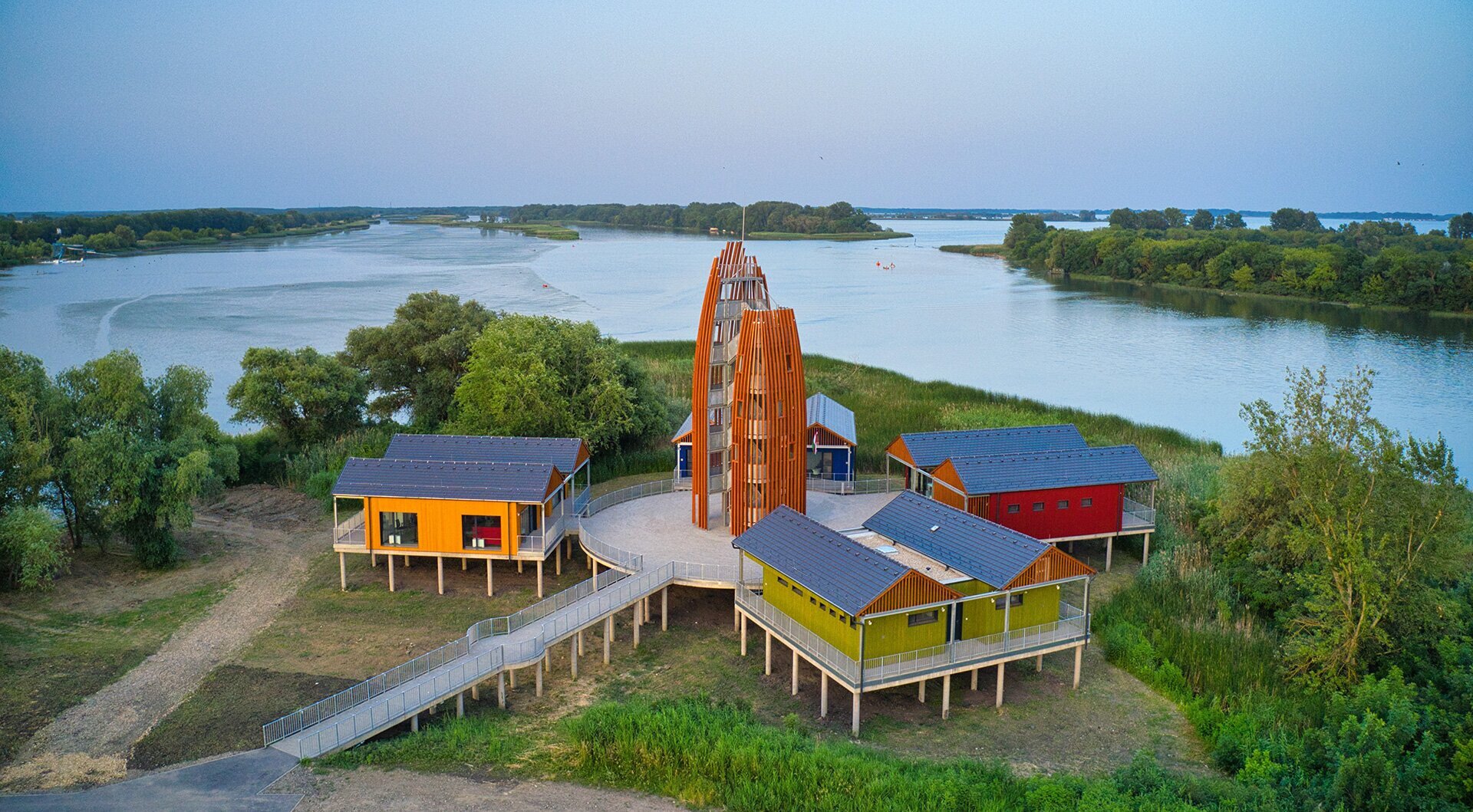 És így néz ki a kilátó a kilátásával, a „lábasházak” színei közül a kék a vizet, a vörös és a sárga a tüzet vagy a felkelő napot, a zöld és az összes épületben megtalálható barna szín pedig a földet szimbolizálja.