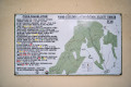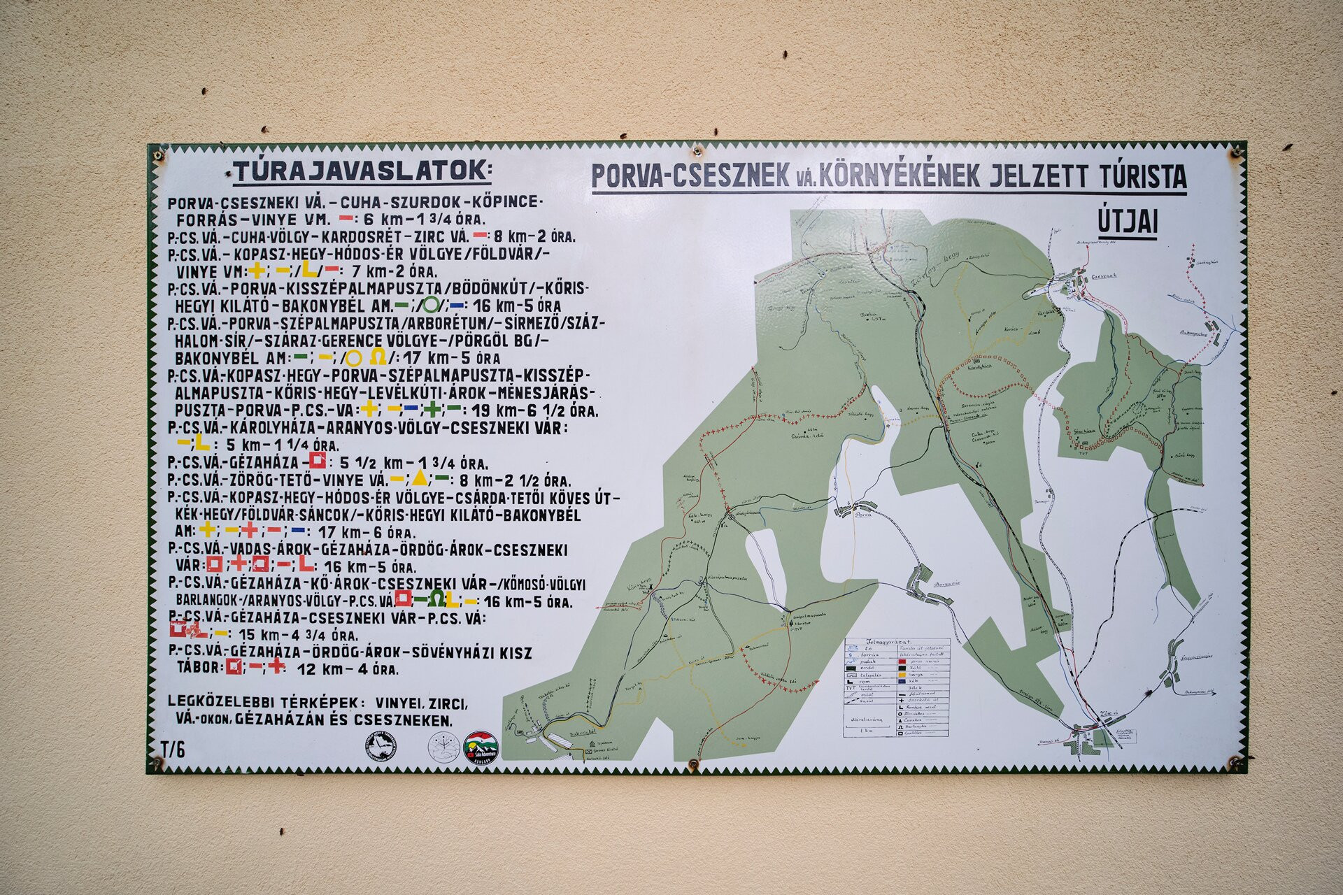 Festett zománctábla mutatja a környékbeli túrautakat Porva-Csesznek állomásépületének falán