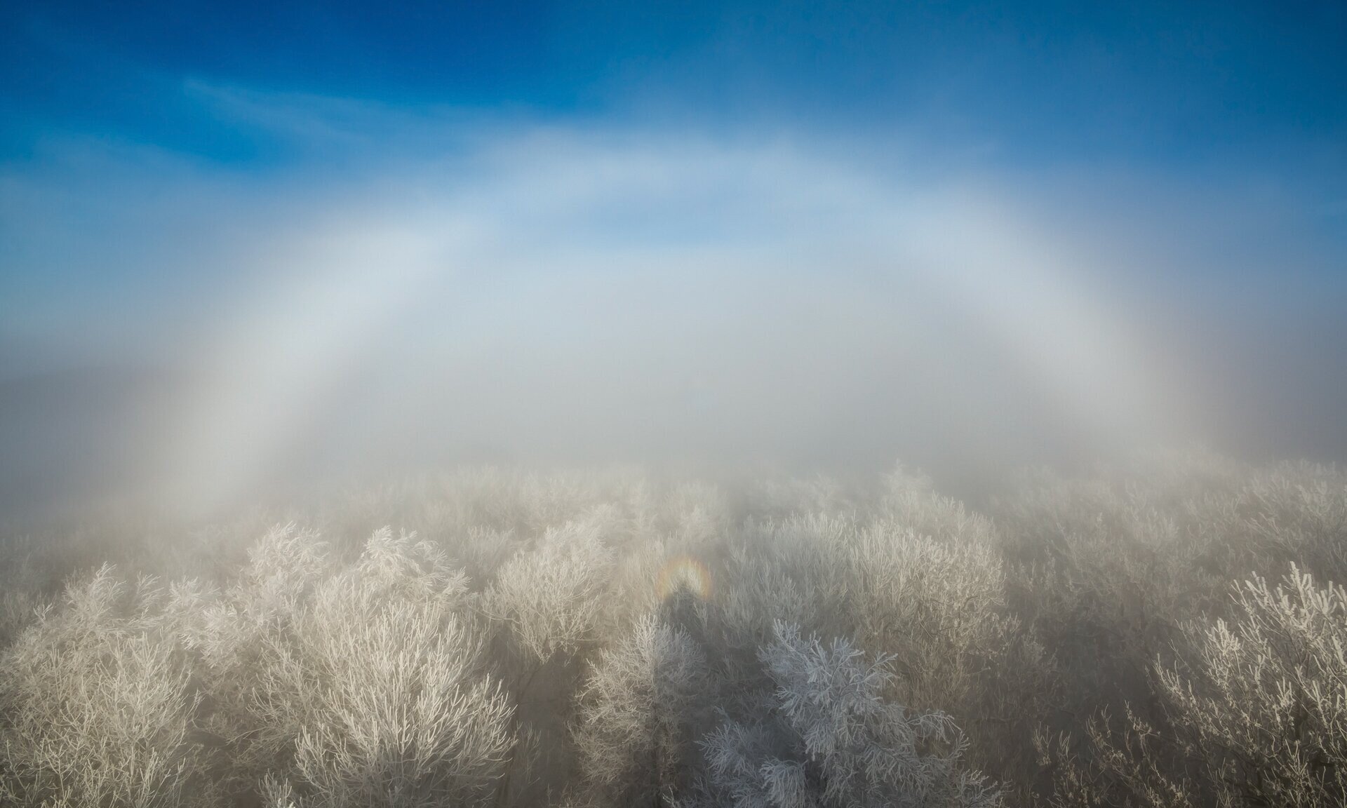 A tél is tartogat szép légköroptikai jelenségeket. Iminek egy ködszivárványt sikerült megörökítenie a Csóványosról, amely nyári, színes testvéréhez képest teljesen fehér. Mintha egy korona került volna a ködös, zúzmarás téli Börzsöny tetejére.